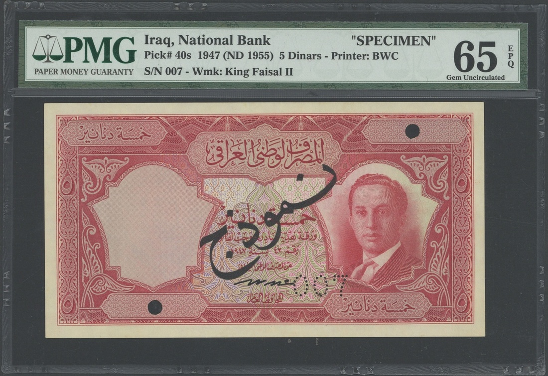 (x) National Bank of Iraq, specimen 5 dinars, law of 1947, no serial numbers, red and multicoloured, King Faisal II at right, value at left and right, signature of Abdul Ilah Hafud low centre, reverse red and white, King Hammurabi receiving the scrolls from the Sun God, Shamash, value at left and at each corner