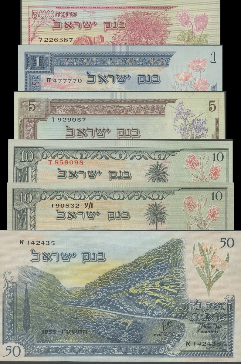 (x) Israel, Bank of Israel, a set of the 1955 series comprising 500 prutah, red and multi-coloured, ruins of synagogue at left, reverse red and pale green, 1 lira, blue and multi-coloured, Gallilean landscape, reverse blue and yellow, 5 lirot, brown and multi-coloured, Negev landscape, reverse brown and blue, 10 lirot, dark green and multi-coloured, Plain of Jezreel, reverse green, 50 lirot, dark blue and multi-coloured. Jerusalem road, all with flowers upper right, all signatures of Hoofien and Horowitz