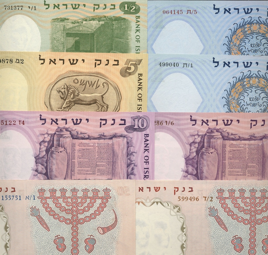 (x) Bank of Israel, 1/2 lira, 1958, green, woman pioneer soldier at left, specimen 1 lira (3), 1958, blue, fisherman at left, all three colour serial number varieties, 5 lirot, 1958, pale brown, worker at left, specimen 10 lirot, 1958, scientist, 50 lirot (3), 1960, pink-brown, pioneer couple at left, all are with Horowitz and Nebenzahl signature