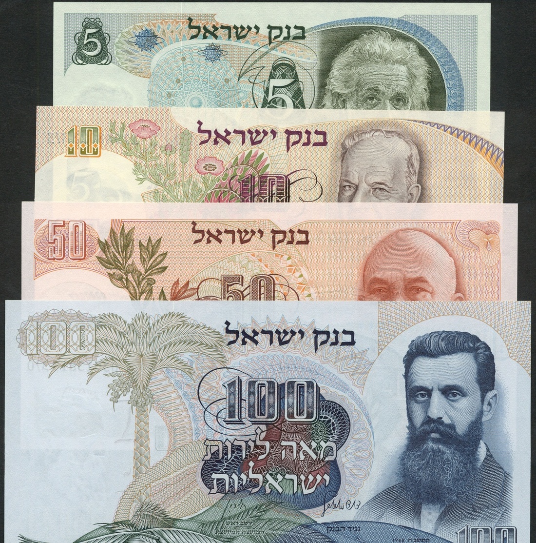 (x) Bank of Israel 5 lirot (2), blue, Einstein, 10 lirot (3), pale brown and pink, Balik at right, 50 lirot (2), pink, Weizmann at right, 100 lirot (4), blue, Herzl at right, ND (1968),