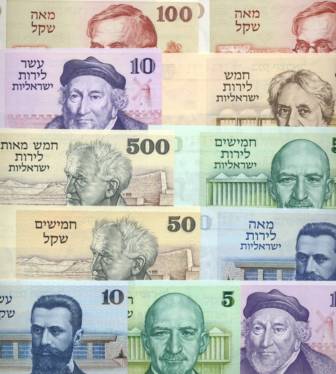 (x) Bank of Israel, a group of the 1973 series comprising 5, 10, 50, 100 and 500 lirot, also 1978 series, 1, 5, 10, 50 (4), 100 lirot (2), one example with two bars below serial number, signatures of Gafny/Horowitz or Gafny/Moseviicz