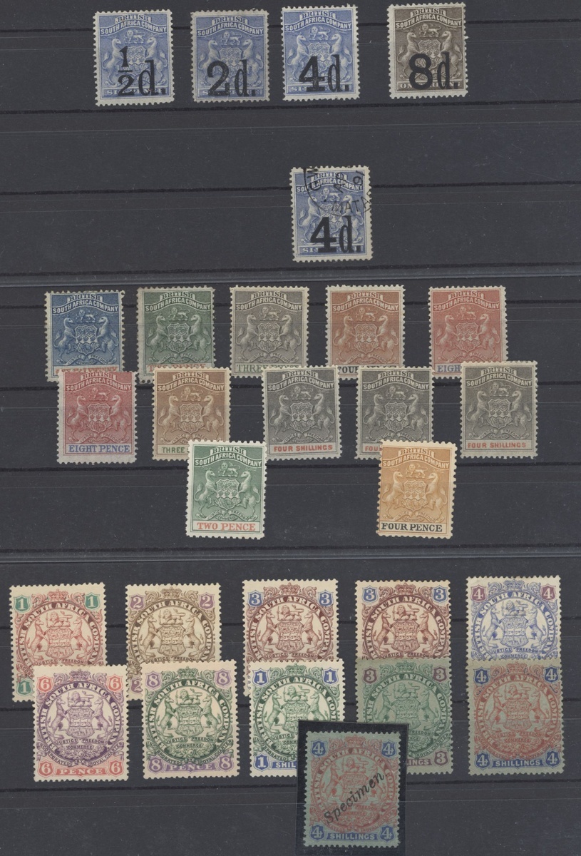 1892 (Jan.) Surcharge set of four unused (2d. tears at foot) and 4d. on 6d. with doubtful Gwelo datestamp, 1892-94 set of seven with additional 8d. and 4/- (2), 1895 2d. and 4d., 1896-97 Die I and Die II sets (latter with additional 4/- handstamped "Specimen"), unused or with part gum, and 1898 3d. heart of the sheet block of four used; fair to fine