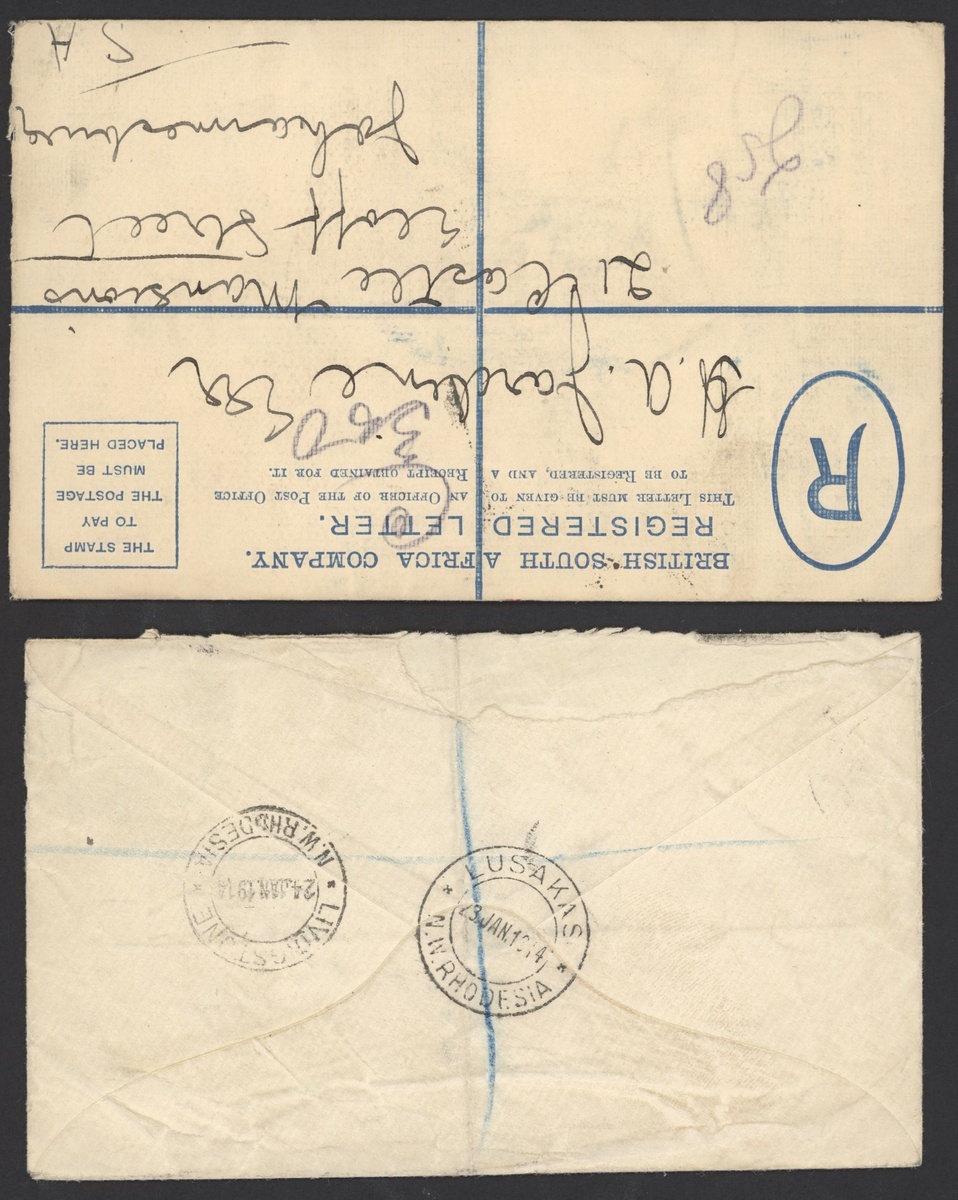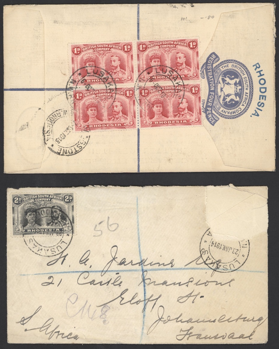 1d. red block of four twice cancelled by Lusakas double-ring datestamp on reverse of 1913 (13 Oct.) 4d. G size registered envelope to Johannesburg, and 2d. on 1914 envelope (another stamp torn away) ex the same correspondence