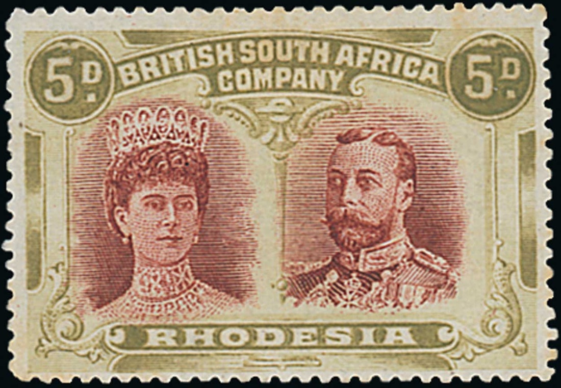 5d. lake-brown and olive, part original gum; a couple of faint tones at upper right, otherwise sound. Scarce. S.G. 175, £800. Photo
