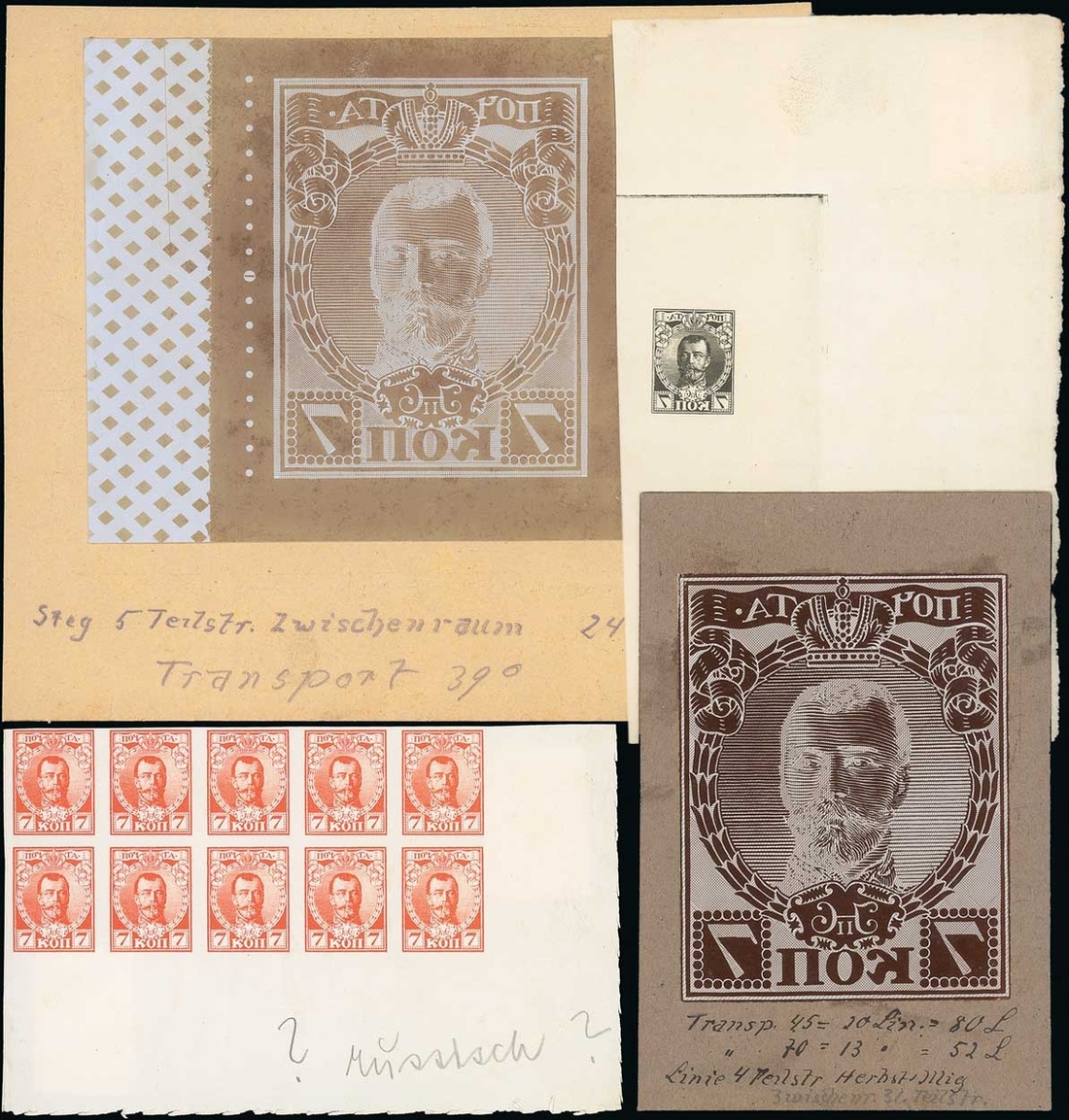 1913 Romanov 7k., two different essays prepared by the State Printing Works, Vienna, very similar to the issued designs though each with different backgrounds, negative impressions in sepia, the first 80x102mm., the second 84x111mm. with both mounted on board with printers notations, also stamp-size die proof, a negative impression in black with solid figures of value and an imperforate proof block of ten (5x2) of a positive impression in orange; fine. The only proofs of this issue so far recorded printed in Vienna. Photo