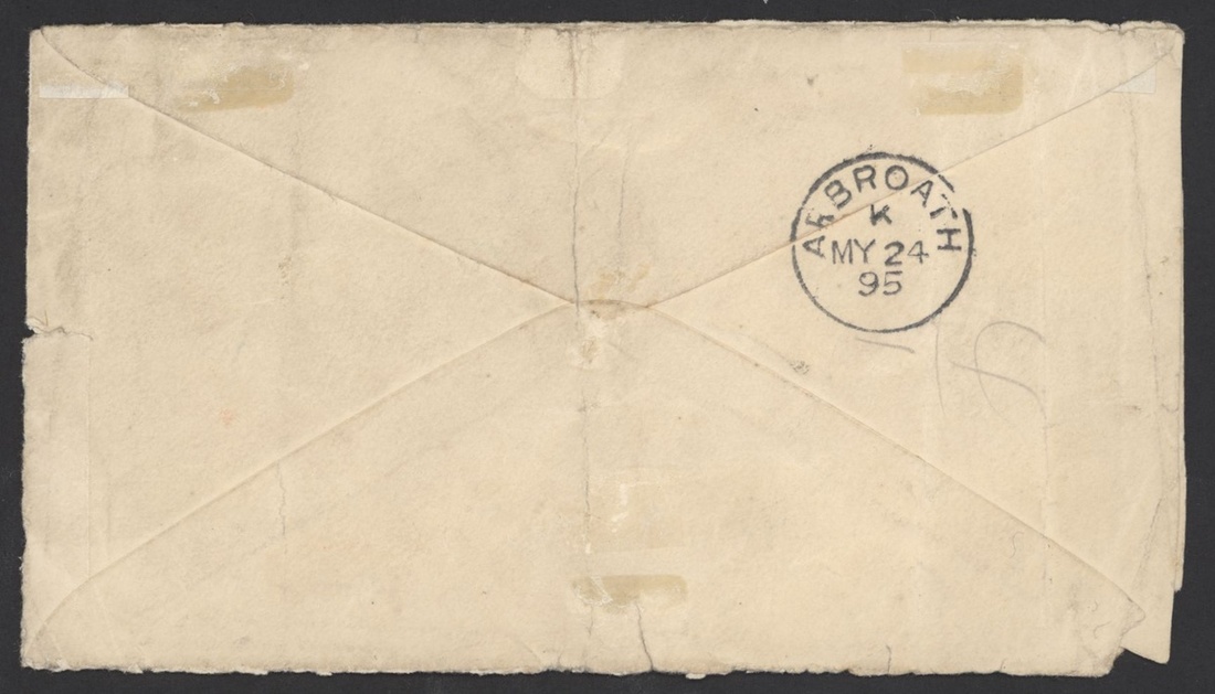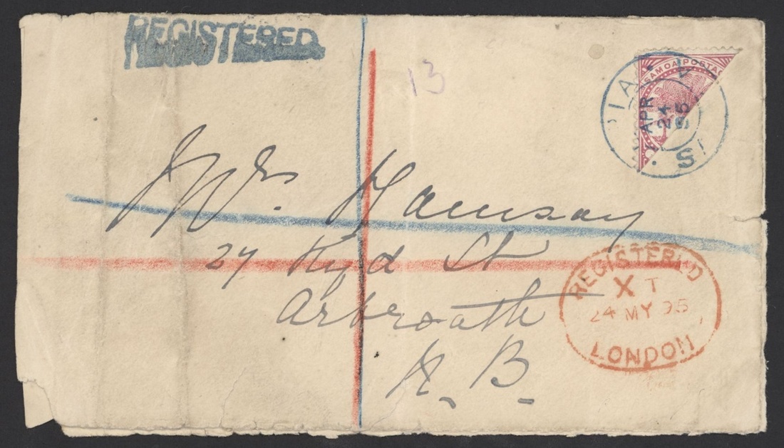 1895 (24 Apr.) envelope registered to Arbroath, bearing 1886 1/- rose-carmine bisected diagonally and tied by datestamp, London Registered d.s. (24.5) on face and arrival of the same date on reverse; the envelope folded and some faults, nevertheless a scarce first day usage. B.P.A. Certificate (2016). S.G. 25a, £350