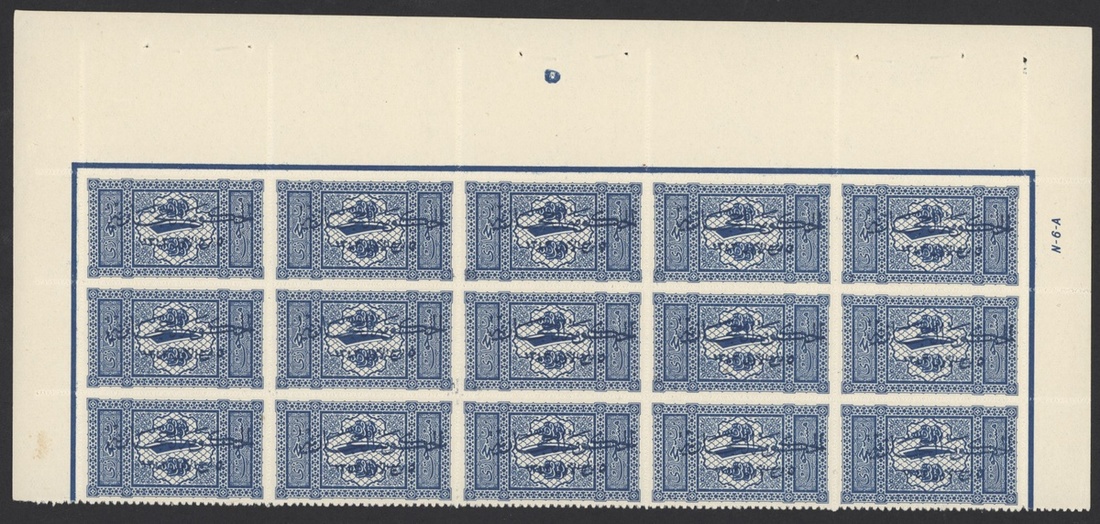 1925 large "Hejaz Government, 4th. October, 1924" blue overprint on Postage Due 1pi. blue block of fifteen (3x5) from the right of the sheet with plate number; unmounted mint, fine. S.G. D91, £825+