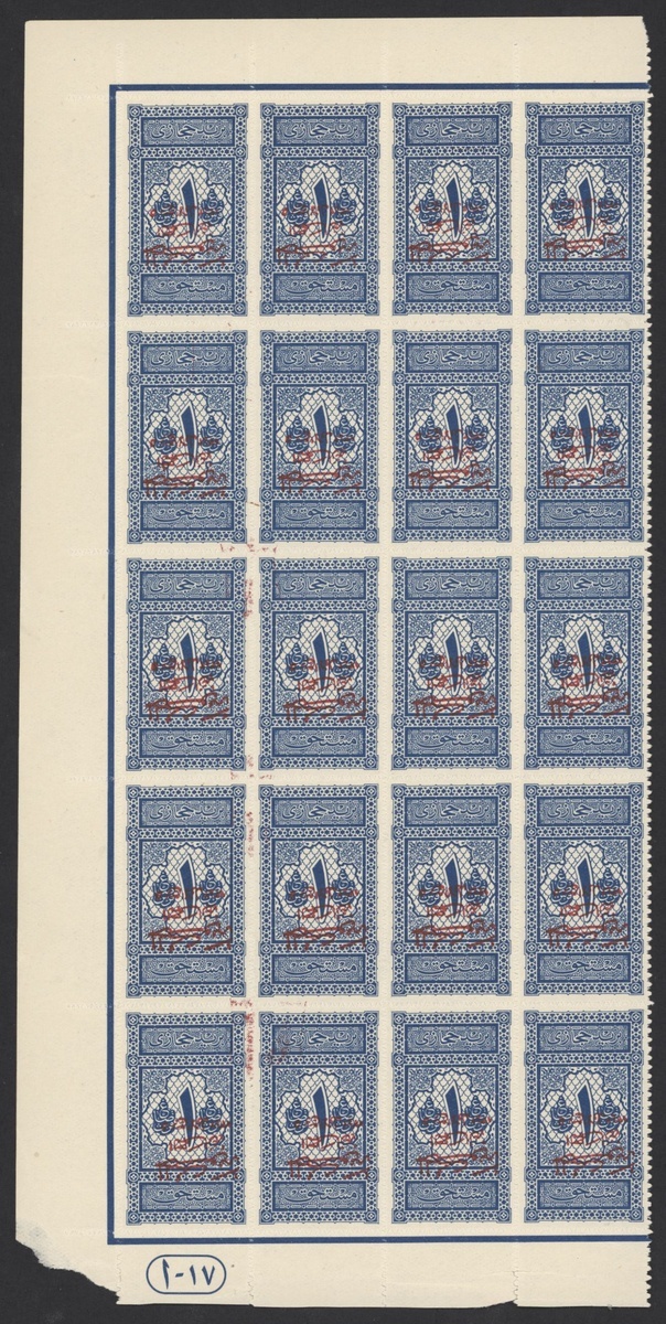 1925 small "Hejaz Government, 4 October, 1924" on Postage Due 1pi. blue block of fifteen (3x5) from the right of the sheet, variety overprint inverted, unmounted mint; a few faults in the margins, otherwise fine. S.G. D94a, £750