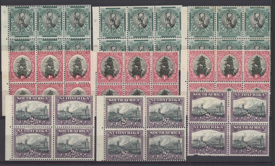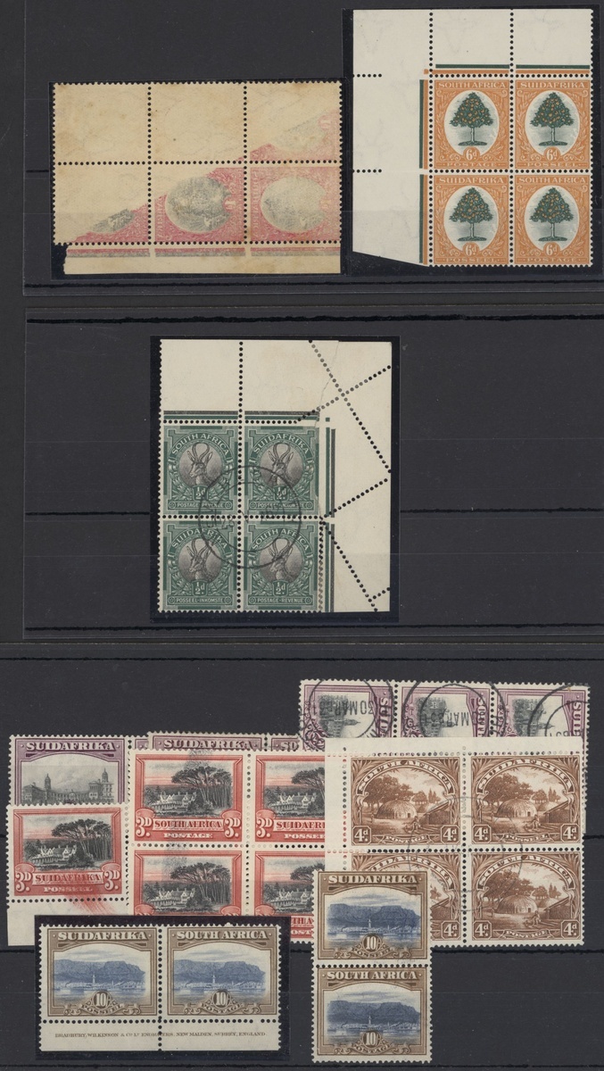 A selection with 1926-27 Pretoria ½d. upper right corner block of four with the right-hand vertical pair affected by gross miss-perforation resulting in the upper right stamp being imperforate between stamp and margin; severed between stamps and right-hand margin affecting the design of the upper right stamp, neatly cancelled by central New Redruth c.d.s. with year date inverted, 1d. marginal block of six (2x3), four stamps and Jubilee lines with part or complete offset, and 6d. upper left corner block of four with extra perforations in left-hand margin; unmounted mint. Also a collection of 1927-30 and 1930-44 South Africa blocks and pairs with various varieties, faults in places, some good to fine