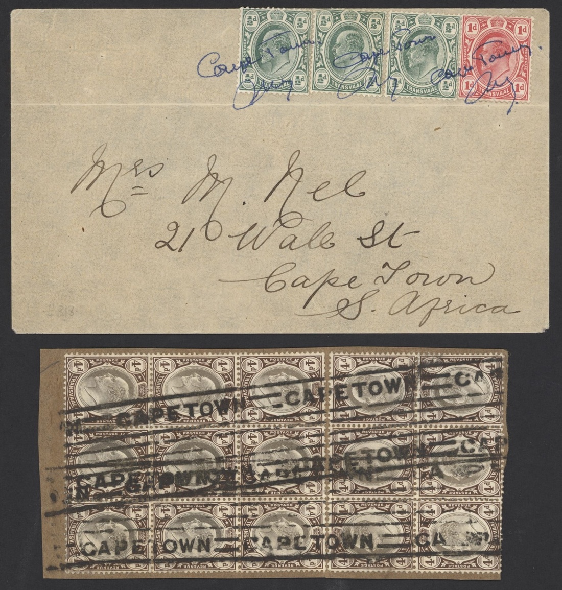 1910 (c.) envelope to Cape Town bearing Transvaal ½d. yellow-green (3) and 1d. scarlet, cancelled "Cape Town" in manuscript, with postmaster's initials, also 1904-09 4d. black and brown (15) in two blocks, tied to parcel piece by