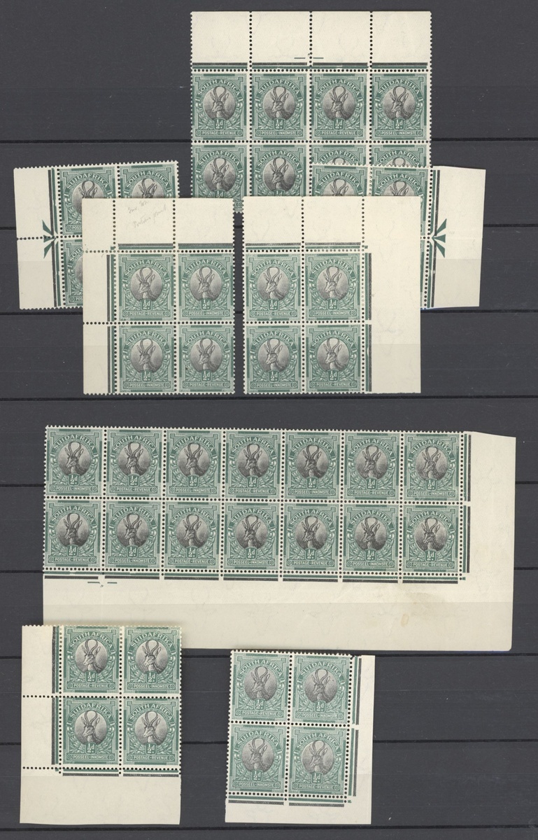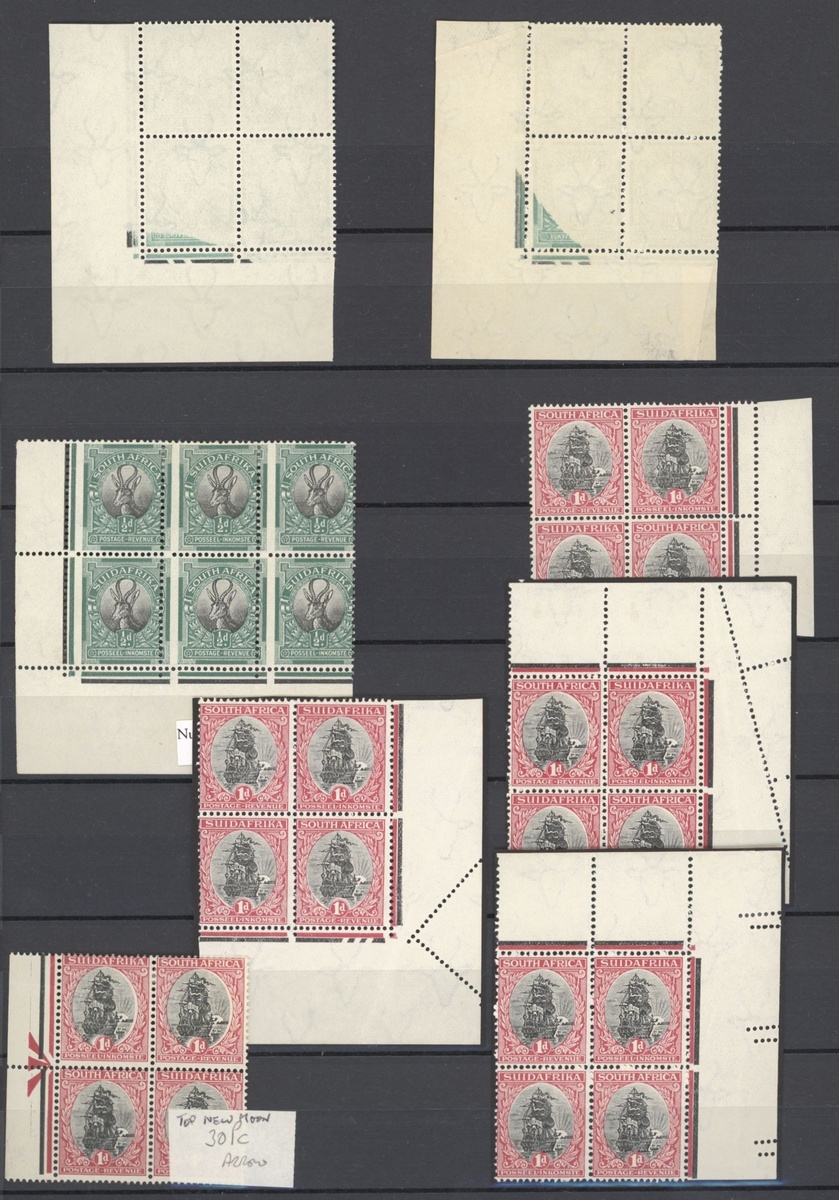1926-27 Pretoria printing range of blocks of four or larger, largely marginal or from the corner of the sheet, comprising ½d. (28) including blocks of four, six and eight with some double horizontal perforations, three with one or two stamps showing partial offset, one with pre-printing creased paper and one with vertical perfs. misplaced 3mm., 1d. (25 and a pair) with some miss-perforations in margin, booklet panes (4), one grossly miss-perforated, a couple with partial offsets, and 6d. (8 and three pairs, all watermark upright), one with miss-perforation in margin and two of the pairs with vignettes misplaced to right, mint and generally fine. An interesting lot