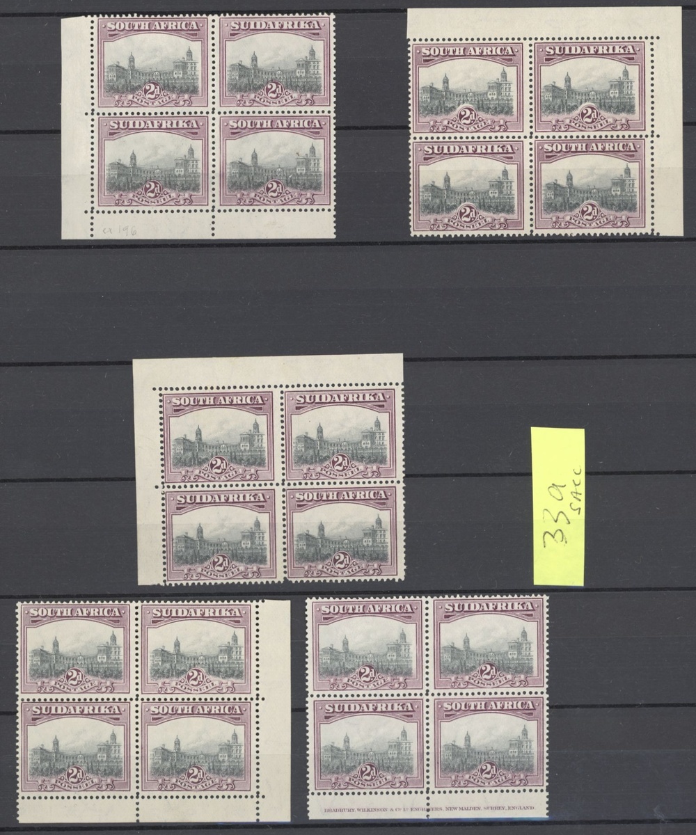 1927-30 issue selection of blocks of four, comprising perf. 14 3d. (5, one with imprint), 4d. (4, one with imprint and one interpanneau) and 1/- (5, one with imprint), perf. 14x13½ down 2d. (5, one with imprint), 3d., 4d. (4, one with imprint) and 1/-, and perf. 14x13½ up 2d. (4), 4d. (3) and 1/- (4), and horizontal pairs with perf. 14 1/-, 2/6d. with imprint, 5/- (2), 10/- and perf. 14x13½ down 3d. (2, one with imprint), mint and generally fine. Cat. £4,500+