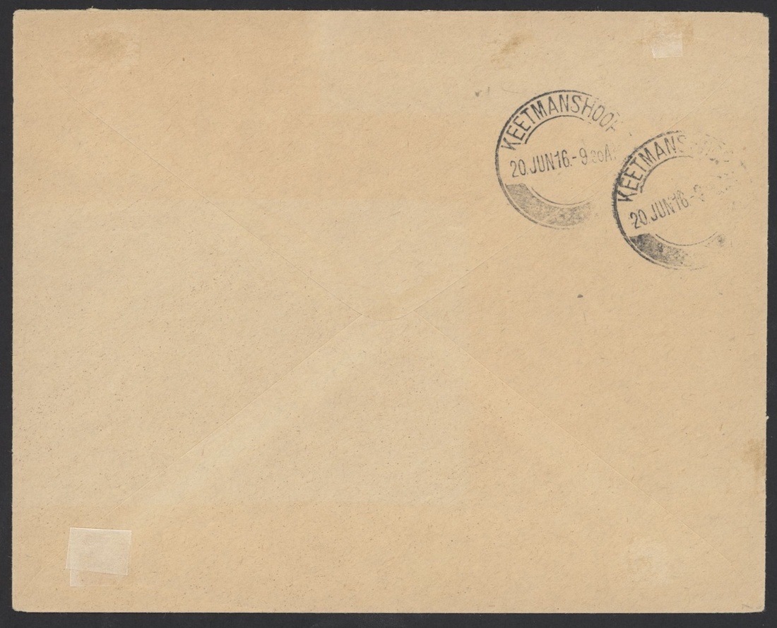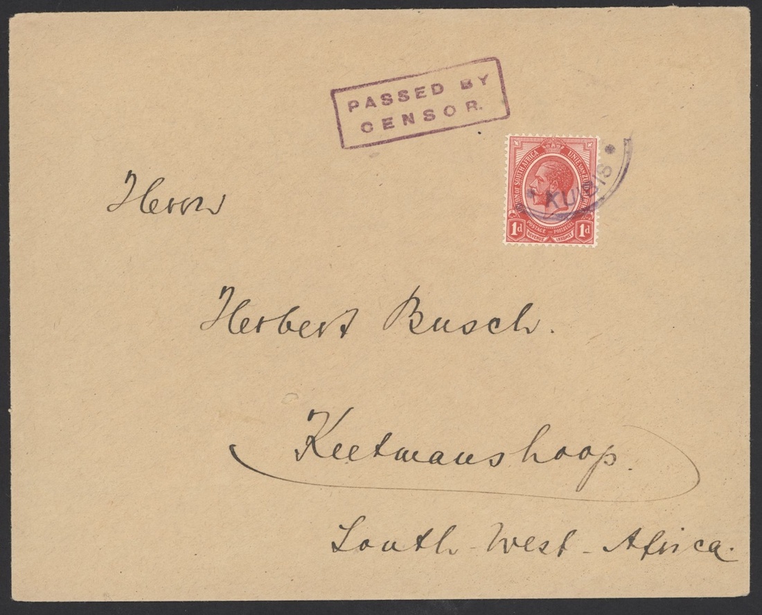 Kuibis: 1916 (June) envelope to Keetmanshoop bearing 1d. with fine strike of the part rubber datestamp, made from the German canceller with the German eagle and lettering removed, boxed censor cachet alongside, arrival datestamp on reverse. Putzel B2