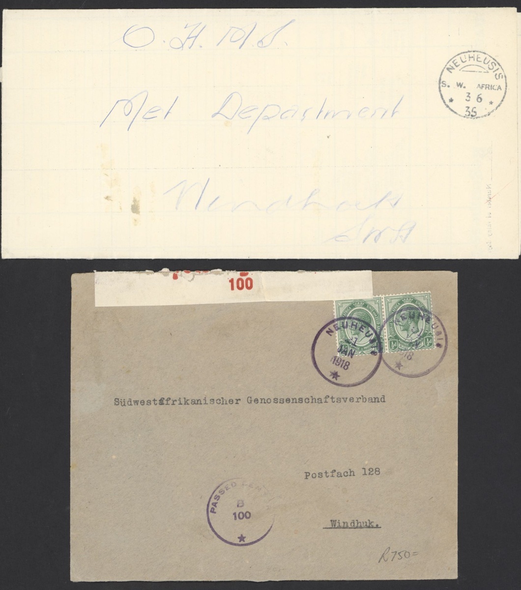 Neuheusis: 1918 (21 Jan.) envelope to Windhoek bearing ½d. pair with two superb rubber datestamps in violet, "100" censor label at top and censor cachet at foot, arrival datestamp on reverse, and 1935 "O.H.M.S." printed Rainfall Record report form to Windhoek with fine converted datestamp. Putzel 3, 4