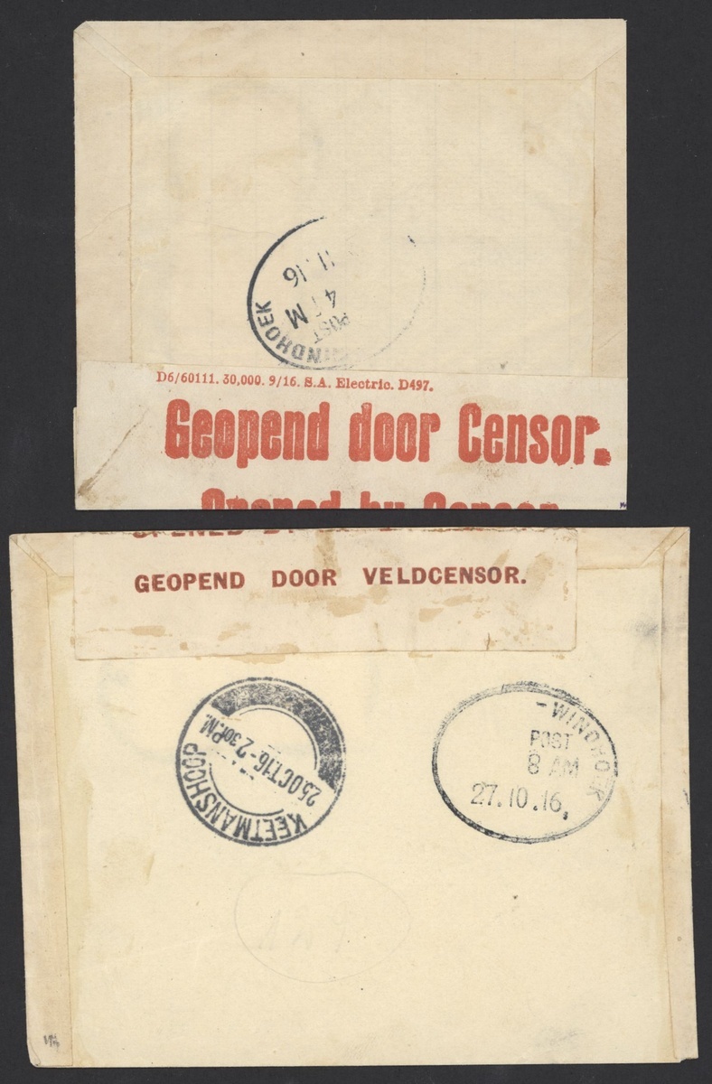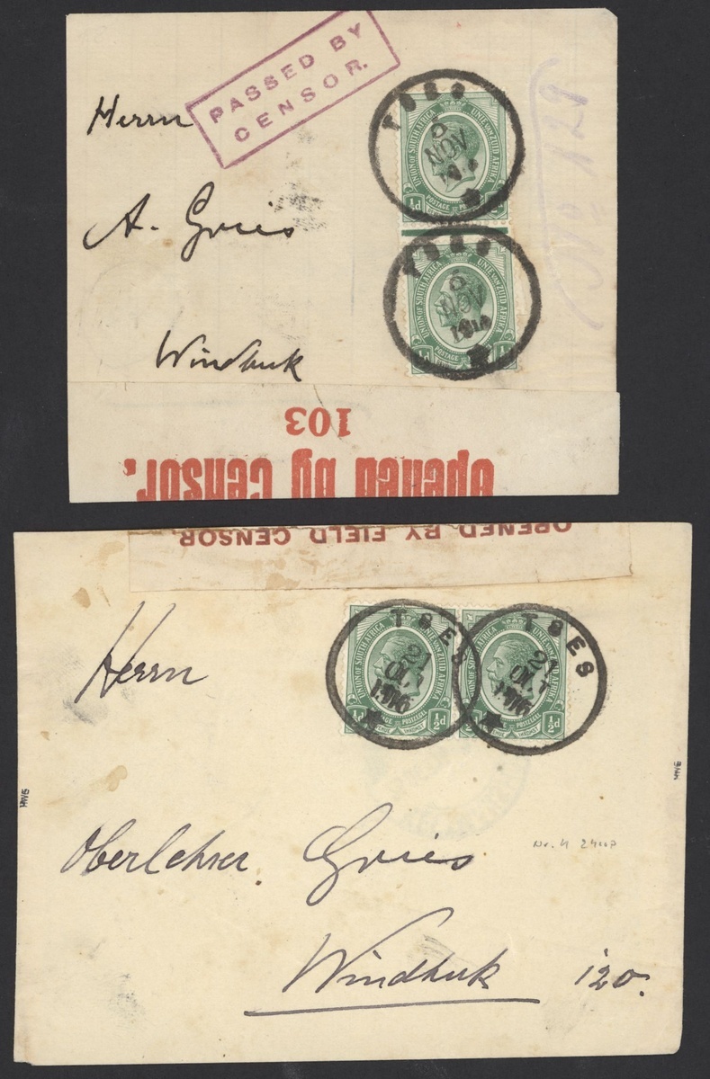 Tses: 1916 (Oct. and Nov.) Gries homemade envelopes to Windhoek, both bearing ½d. (2) cancelled with good strikes of the rubber datestamp and with transit and/or arrival datestamps on reverse, both with censor labels and the latter also with boxed censor cachet; an unusual pair with early dates for this scarce datestamp. Putzel 4