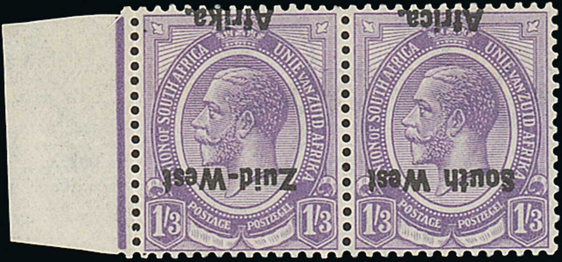 1/3d. pale violet marginal horizontal pair from the left of the sheet, variety overprint inverted,  fine mint. Scarce. S.G. 8a, £400. Photo