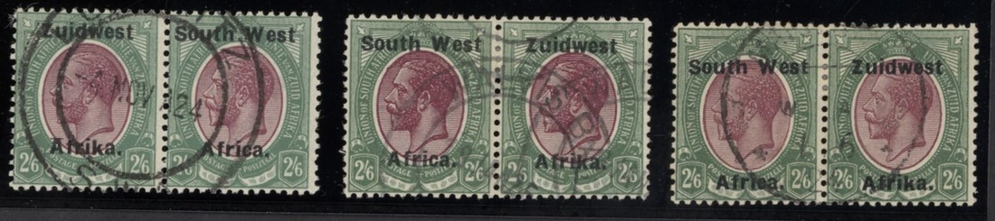 1924 (29 June) Setting IV 2/6d. purple and green horizontal pairs (3), one with large part Luderitz 1924 datestamp, one with two part Walvis Bay 1925 datestamps and one with indistinct German type datestamp; good to fine and an attractive trio. S.G. 28, £510