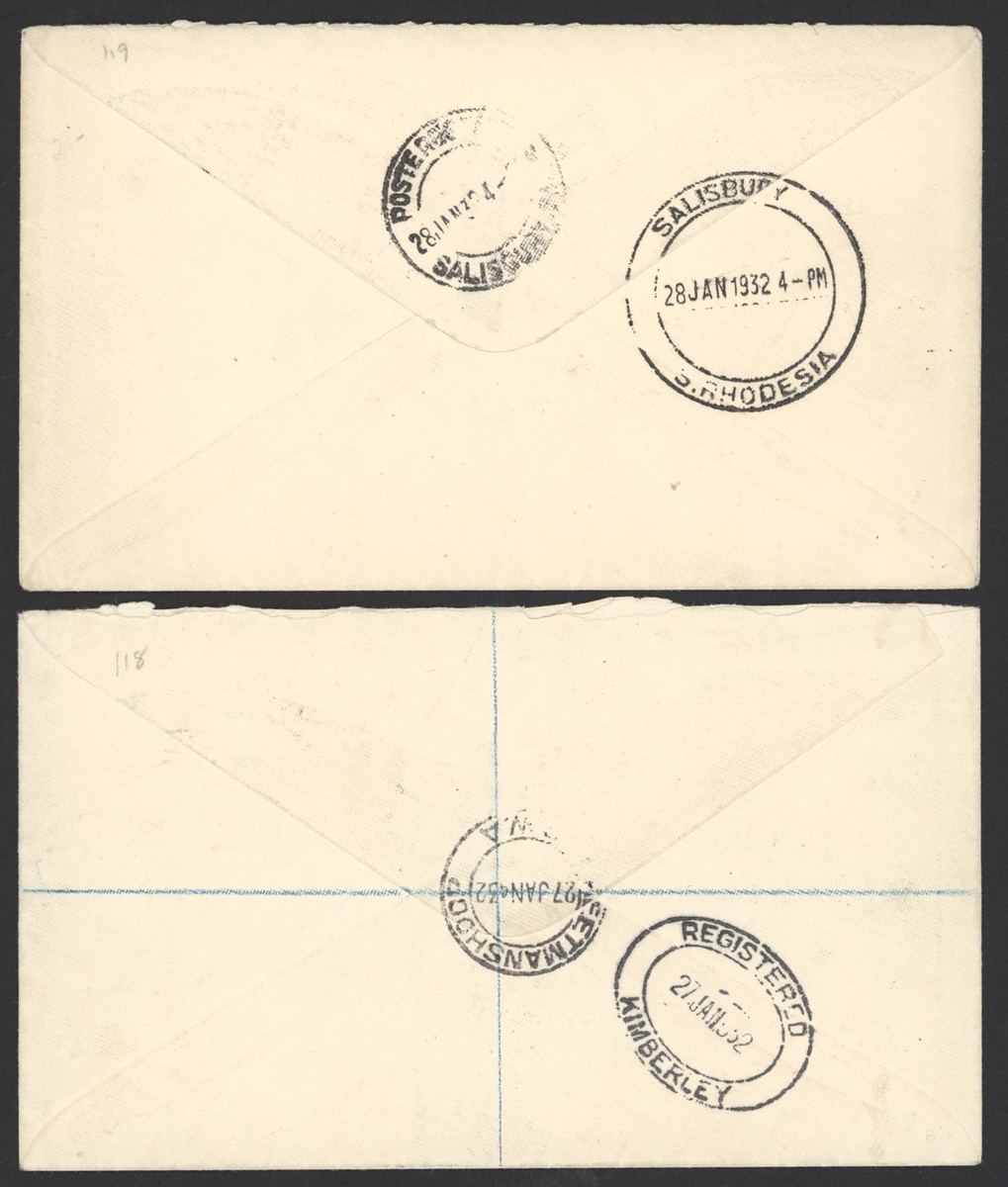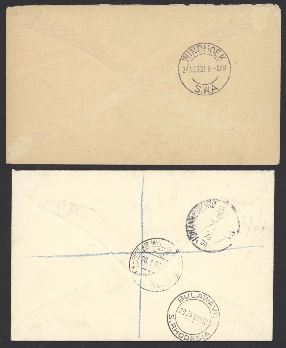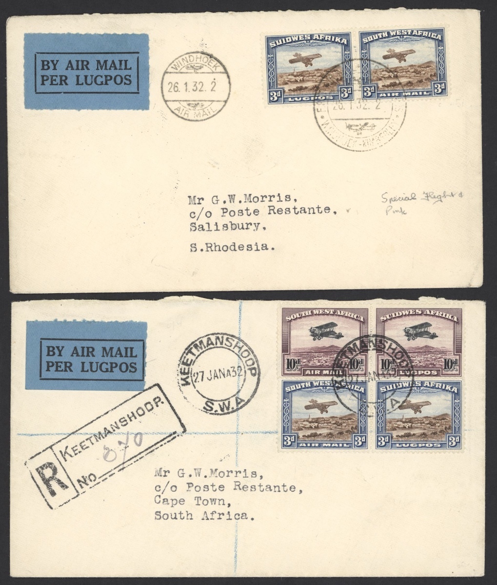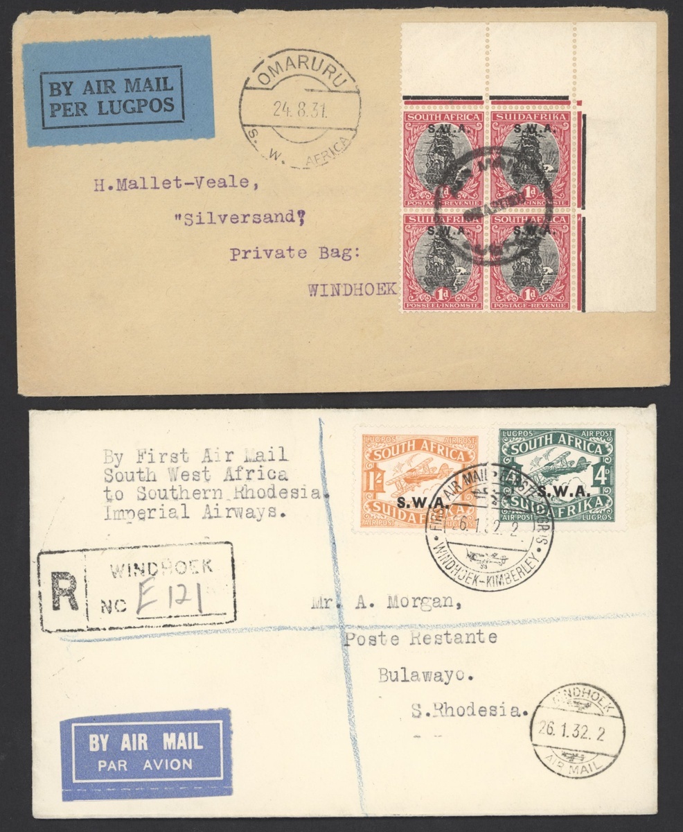 1931 (Aug.) flight envelope from Omaruru to Windhoek bearing 1930 overprint at top 1d. upper right corner block of four, 1932 (Jan.) first flight envelopes (3) comprising Windhoek to Salisbury bearing Air 3d. pair, Keetmanshoop registered to Cape Town bearing Air 3d. and 10d. pairs and Windhoek registered to Bulawayo bearing Air large overprint later printing 3d. and 1/-; a fine quartet. Stamps cat. £270