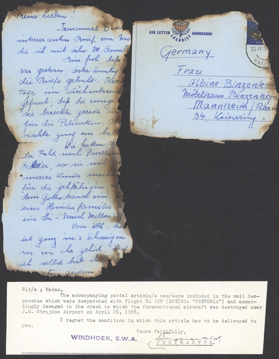 1968 (20 Apr.) charred remnants of an envelope and aerogramme from Windhoek to Germany and from mail recovered from Boeing 707 (The "Pretoria") which crashed at Windhoek on 21 April with the loss of 123 persons,   both accompanied by a typed explanatory notice from the Windhoek Postmaster and the envelope with an "ambulance" cover for onward transmission; scarce