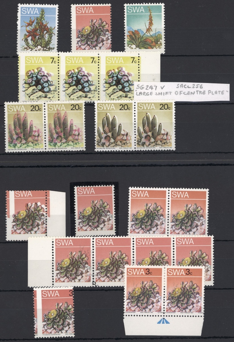 1973 (Sept.) Succulents selection  comprising 1c., 3c. (9 with a pair and a strip of four) and 10c., all variety value omitted (or hugely misplaced on the strip with only one value showing), 3c. pair with value misplaced, 3c. with whole design misplaced, 7c. marginal strip of three with design misplaced 3mm. horizontally, and 20c. pair with variety extra cactus due to misplaced lilac; fine unmounted mint. Cat. R. 12,000