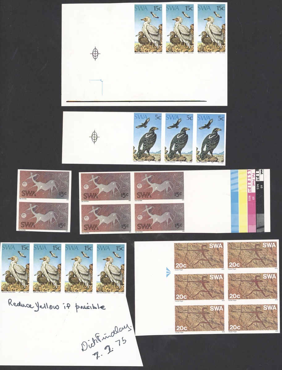 1974 (Apr.) Rock-Engravings set of three in blocks of six, 1975 (Mar.) Birds of Prey set of four in strips of three and sets of three (10c.)/four, and 1976 (Mar.) set of four in marginal blocks of six (2x3), all imperforate proofs with one group of the Birds marginal and signed by the designer with instructions to the printer for charges in colour to two values. Cat. R.30,000+