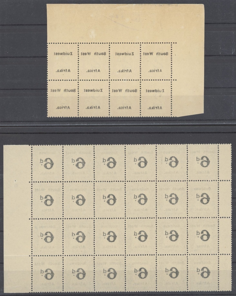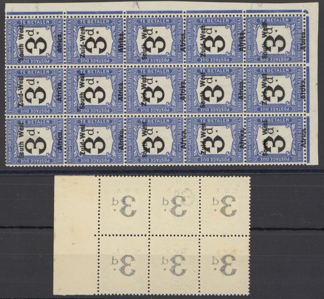 1923 (Jan.-July) Setting I South Africa De La Printing 3d. black and blue lower right corner block of fifteen (3x5) showing progressive overprint displacement to foot resulting in the lower row with "Africa./Afrika." over perforations at foot, Row 8/6 variety "Wes" for "West", fresh mint; one non-variety stamp with thin spot, otherwise fine. Also 1924 Setting VI on South Africa Pretoria printing 2d. upper left corner block of eight showing sharp offset of overprint, 1927 6d. marginal block of twenty-four and 1928-29 on South Africa 1922-26 3d. marginal block of six, both showing fine offset of value. S.G. D4, 4a, 30, 38, 40