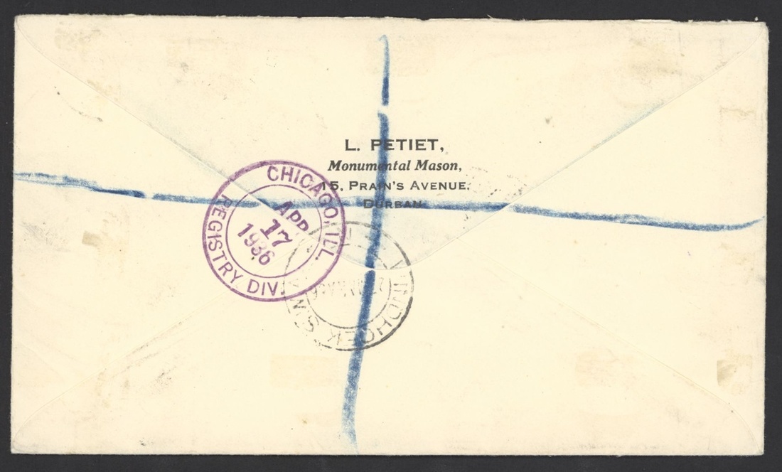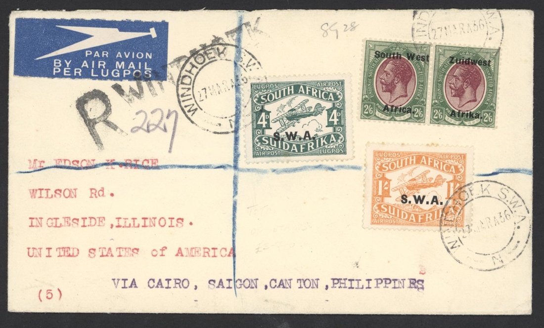 1936 (27 Mar.) envelope registered from Windhoek "Via Cairo, Saigon, Canton, Philippines" to U.S.A., bearing 1924 Setting IV 2/6d. pair and 1930 Air 4d. and 1/- neatly cancelled, Chicago transit datestamp on reverse. Photo