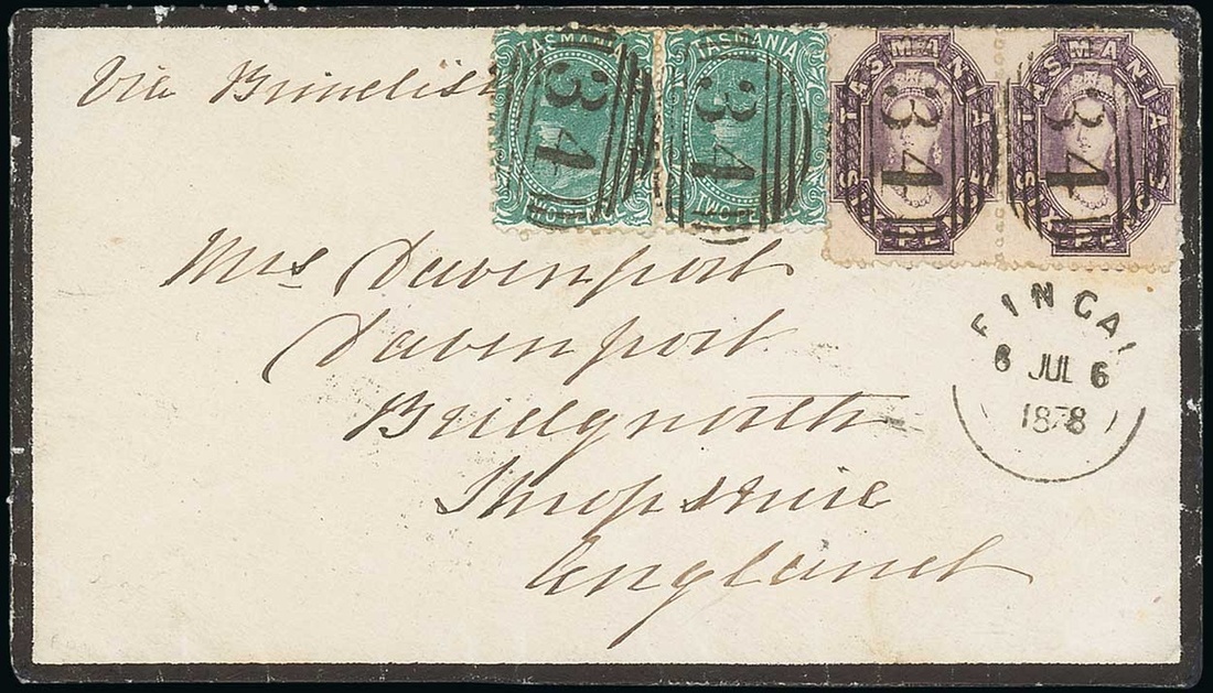 1878 (6 July) double rate mourning envelope from Fingal "Via Brindisi" to England, bearing Chalon perf. 11½ 6d. bright violet pair and Sideface perf. 11½ 2d. green pair (one with small corner tear) each cancelled with superb strikes of "34" numeral and with fine despatch datestamp below, Launceston (7.7) and Bridgenorth (27.8) datestamps on reverse. A scarce and highly attractive mixed-issue franking. S.G. 138, 145a. Photo