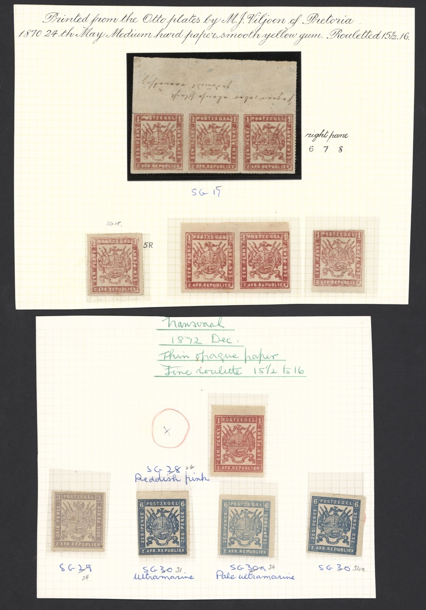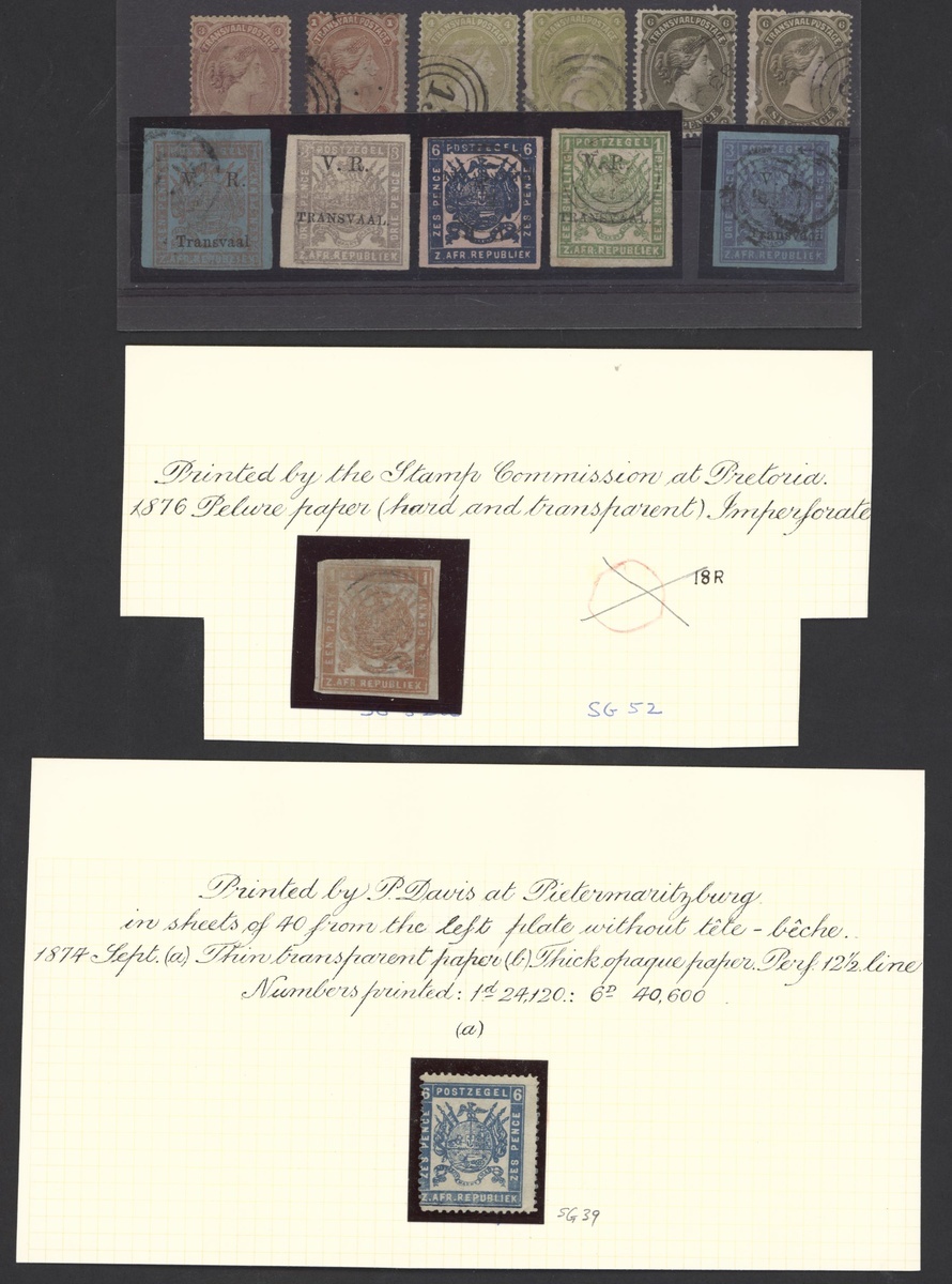 1870 Viljoen medium paper, rouletted 1d. (7 with a marginal strip of three and a pair), 1871 Otto 3d., 1872-74 Borrius, thin transparent paper 1d., thin opaque paper 6d. and thickish wove paper 6d. (two shades), 1874 Davis 6d., all unused, 1875-77 Stamp Commission, very thin pelure paper 1d. used, 1877 (June) imperf. 1d., 6d. and 1/- used, 3d. unused, 1877-79 3d. mauve on blue used and 1878-80 1d. (2), 3d. (2) and 6d. (2) used; condition mixed though an interesting group