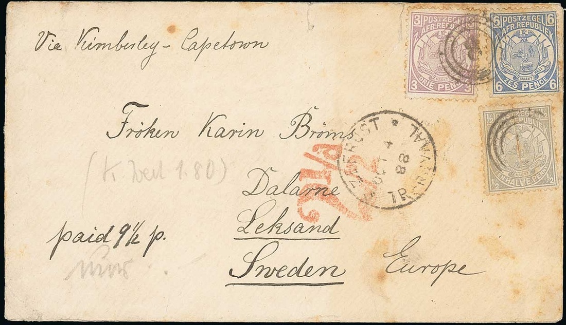1888 (Oct.) envelope from Zeerust "Via Kimberley - Capetown" to Sweden, bearing ½d., 3d. and 6d. for the 9½d. rate, twice cancelled "8" and with despatch datestamp and "2½d" accountancy handstamp in red alongside, various transit datestamps on reverse; a few small faults though an unusual rate and scarce destination. Photo