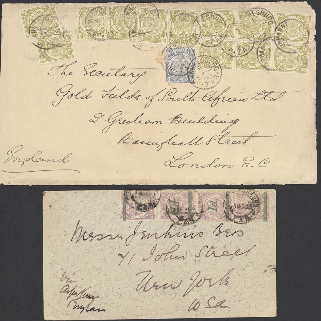 1889-96 envelopes (13) mainly to Europe with a variety of values and frankings, three bearing 1895 1d. on 2½d. to Pretoria (2), Vienna (1 or 2) and USA (4), one from Pilgrim's Rest to England with 2d. olive-bistre (4), another from Pietersburg to England with 6d. pale blue, and three large items from Johannesburg to the Secretary of the Gold Fields of South Africa Ltd. in London franked at 1/- (2) or 2/6d.
