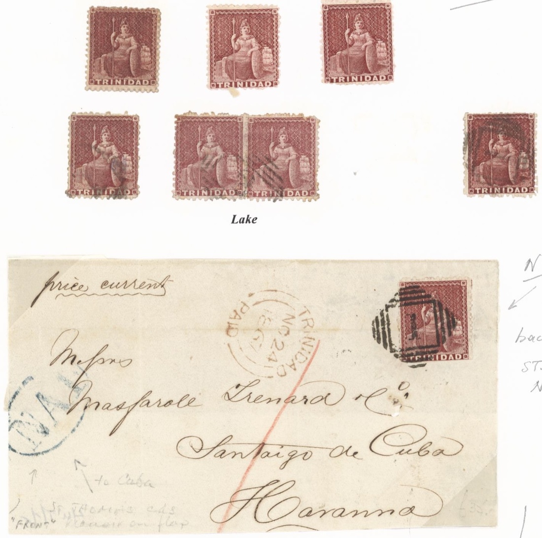 1863-75 perf. 12½ selection with (1d.) (13, six unused and one on front), 4d. violet/lilac (11, five unused), 4d. grey (2), 6d. (13), 1/- lilac/mauve (8, two unused), 1/- chrome yellow (3), and 1869 perf. 12½ 5/- (7), generally good to fine. Also Tobago 1850 copy of The Tobago Chronicle addressed to Scotland without postal markings, the back page with an announcement concerning the introduction of registered letter post at Tobago with the fee being 6d.