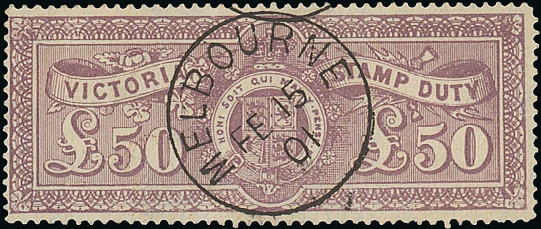 1884 watermark V over Crown Type 33, Stamp Duty £10 mauve and 1897 watermark V over Crown Type 33 £50 bright mauve, both neatly cancelled-to-order with centrally applied Melbourne 15 February 1901 datestamp; fine. S.G. 264, 290, £850. Photo for £50