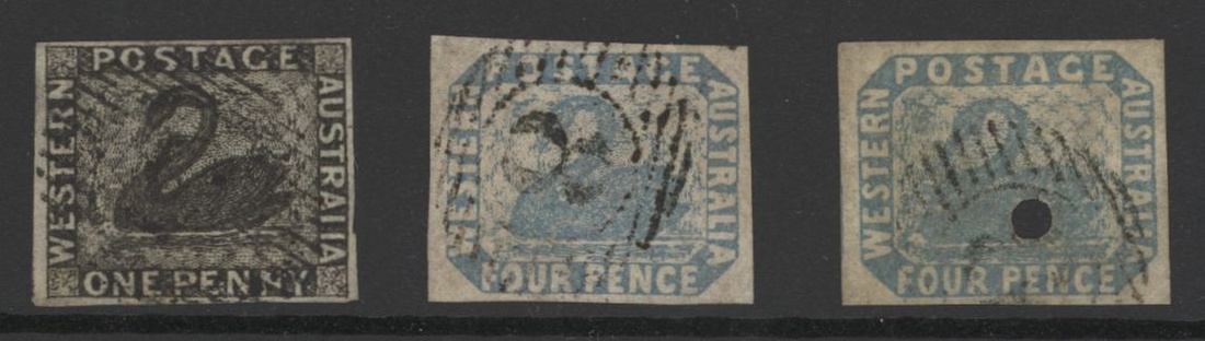 1d. black with good to large margins and lightly cancelled, 4d. pale blue (2) with good to large margins, one cancelled "8" (Fremantle), the other with Official 3mm. puncture. Cat. £475+