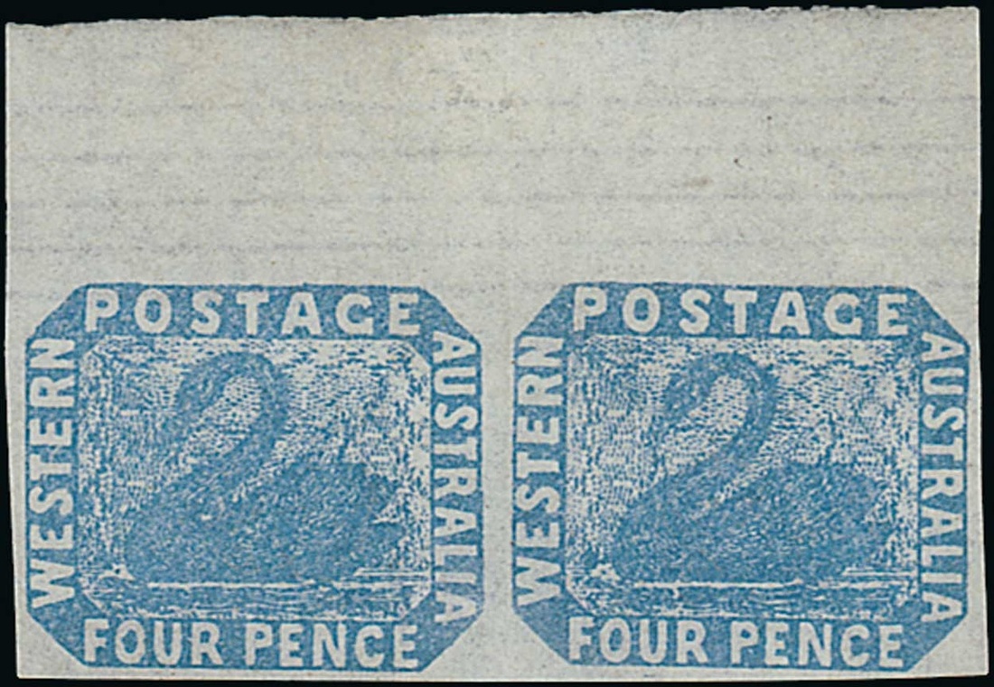 4d. blue marginal pair from the top of the sheet, fresh unused without gum; vertical crease between impressions, otherwise fine and most attractive. B.P.A. Certificate (2003). S.G. 3a, £900+. Photo