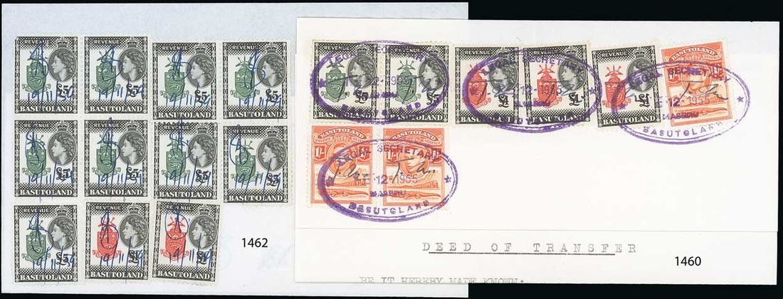 1959 (Nov.) General Notarial Bond bearing 1953 £1 (2) and £5 (9 with a block of four) all dated in manuscript. A rare franking. Barefoot 80, 81, £1,255+. Photo