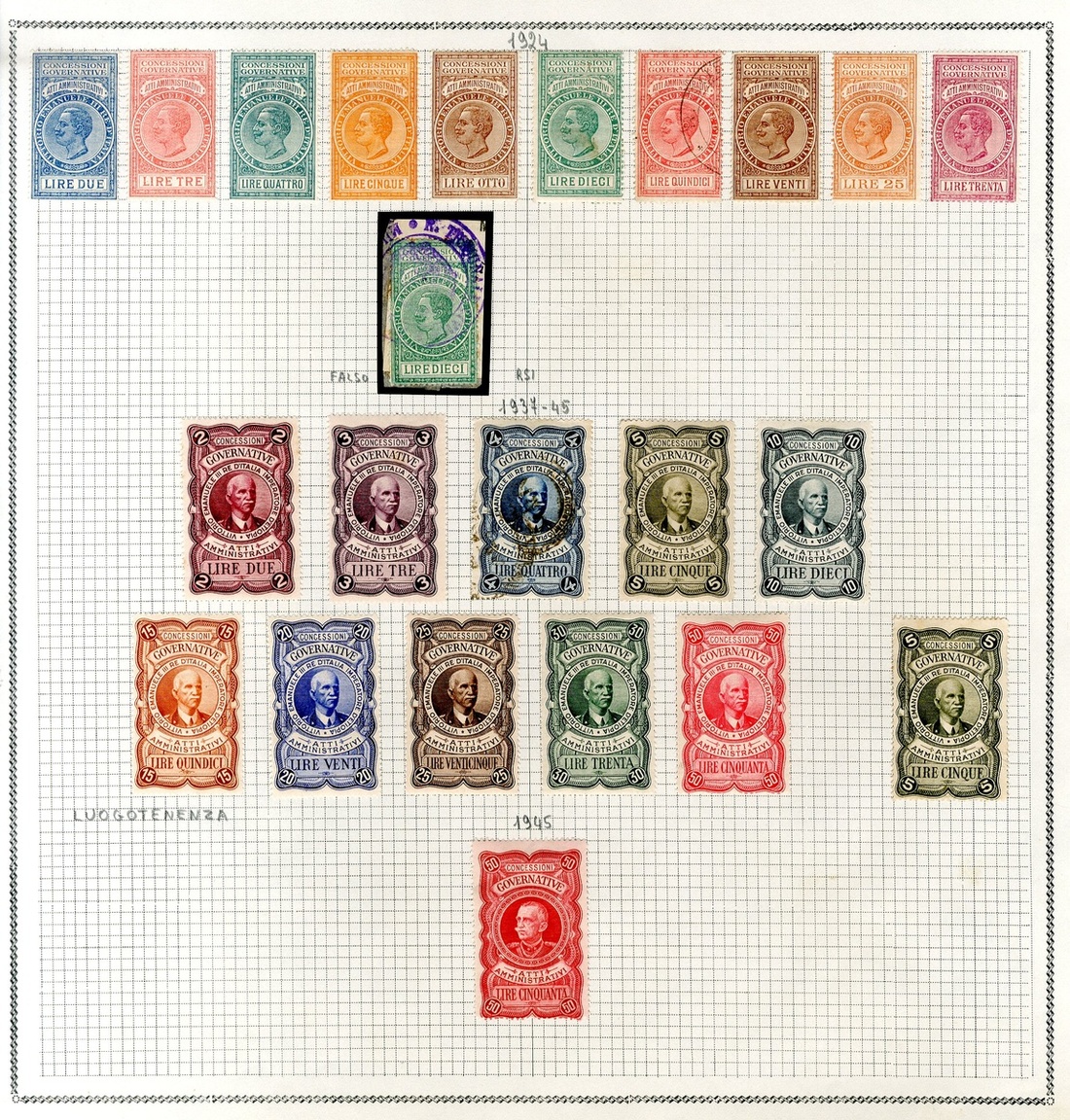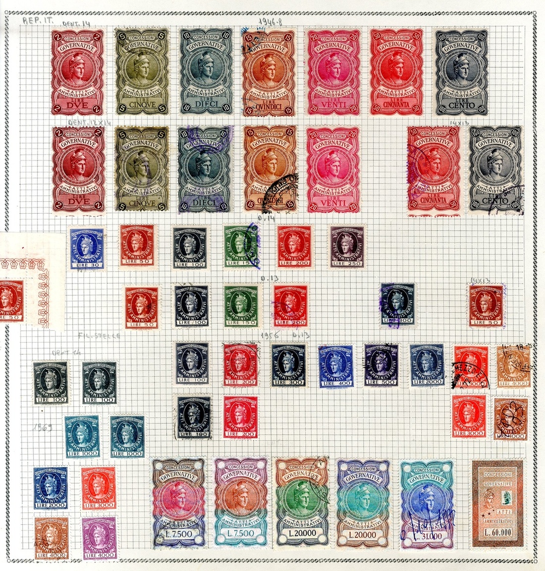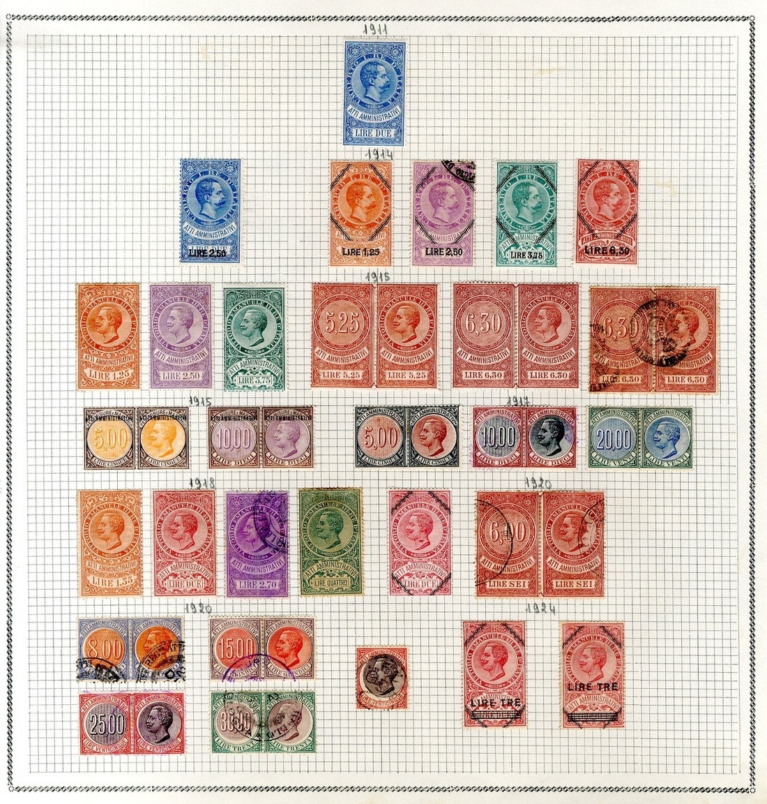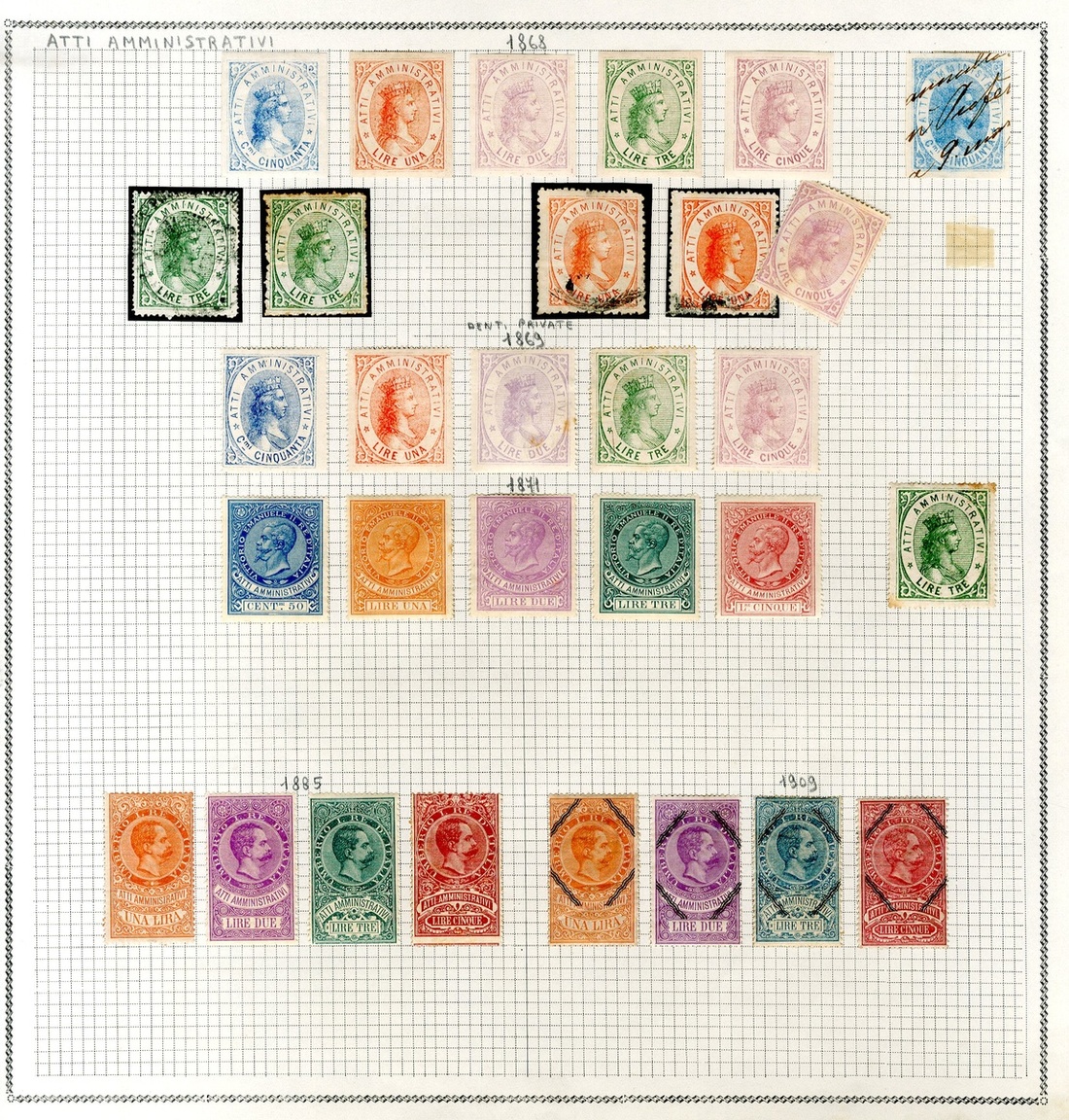 Atti Amministrativi: 1868-1998 mint and used collection (130+) including 1868 5L. unused, 1869 set unused, 1885 sets mint and used, 1914 surcharge set of four, 1915 5L. 25 and 6L. 30, 1918 2L. 70, 1914 2L. 50 on 2L. mint, 1924 10L. forgery, etc., chiefly good to fine