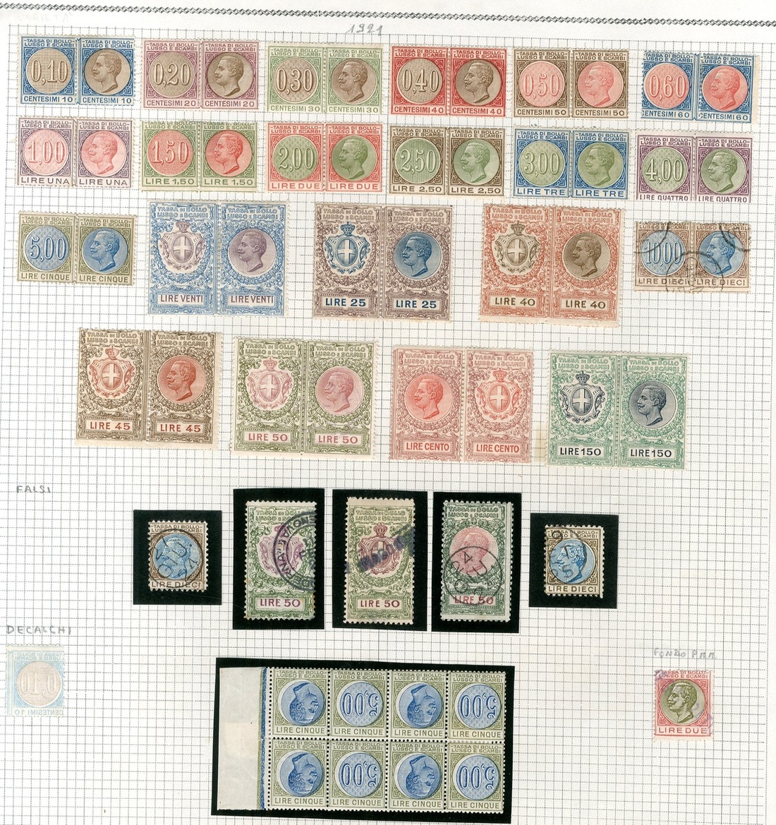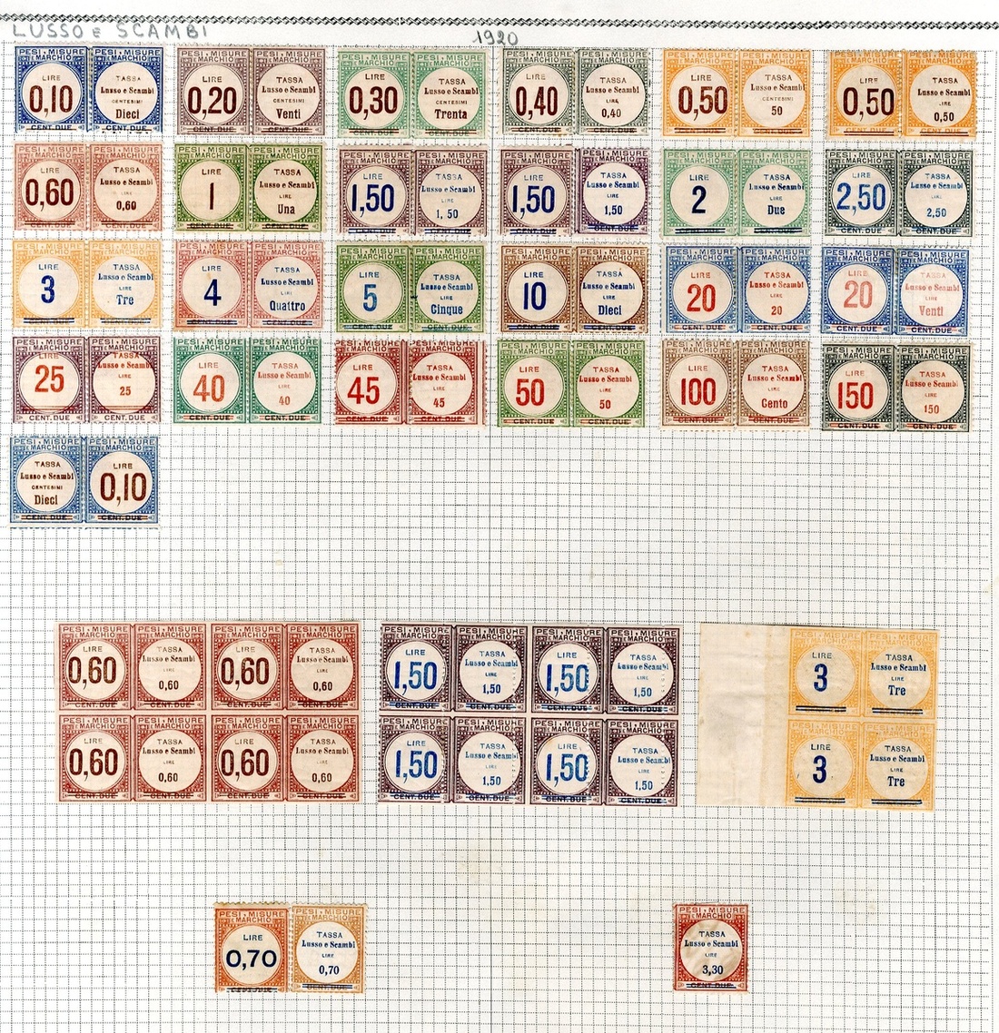 Luxury Goods and Hotels: 1920-38 mint and used collection (150+) on pages including 1920 with values to 150L. in mint pairs, 1921 with values to 150L. in mint pairs, 5L. centre inverted mint block of four pairs, 10L. (2) and 50L. (2) forgeries, etc., chiefly good to fine