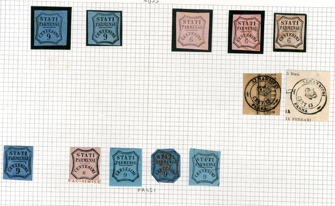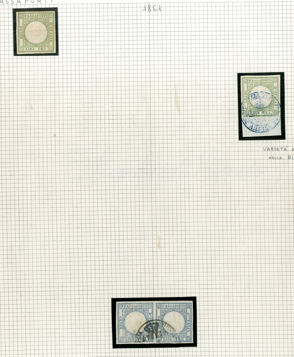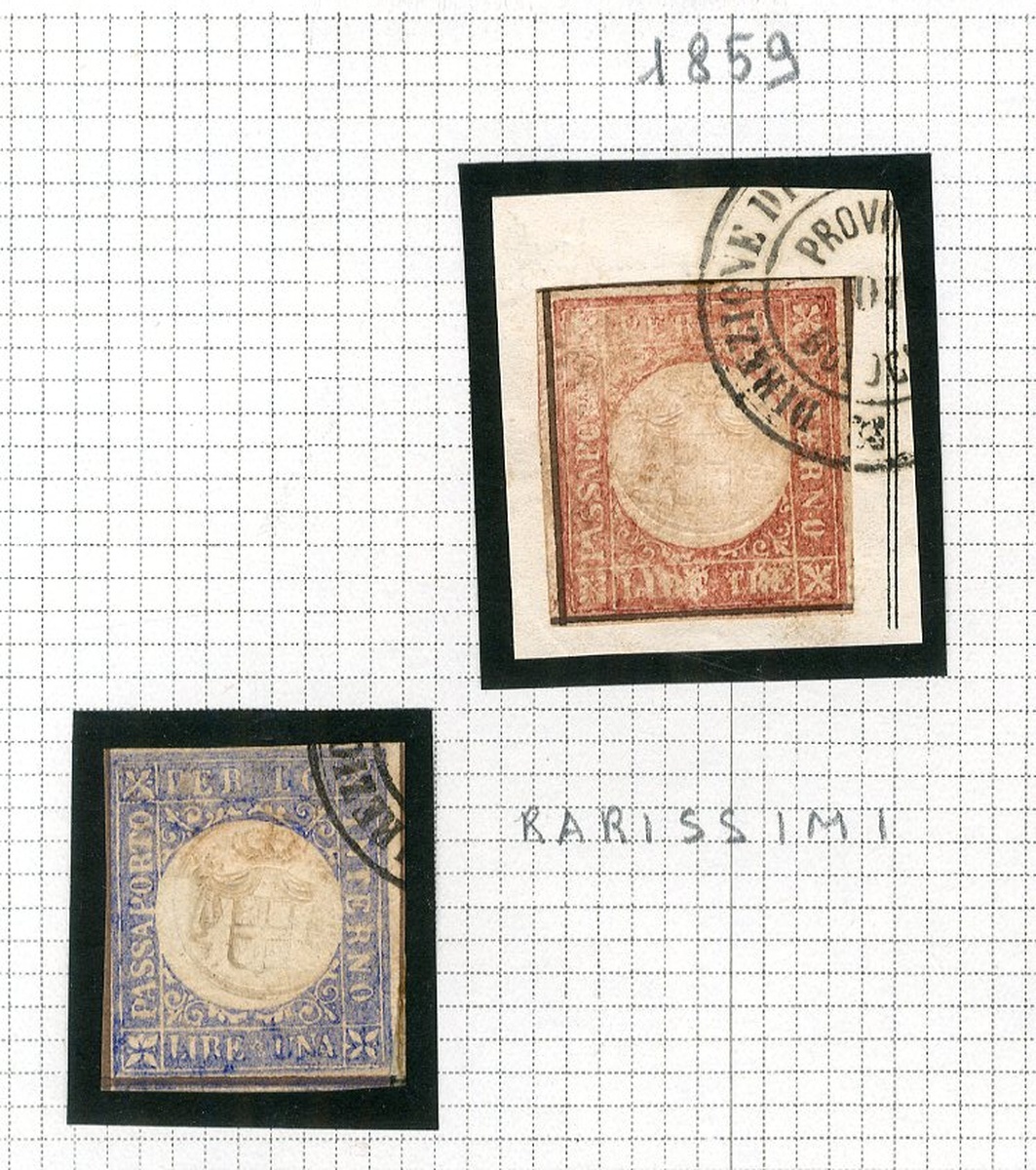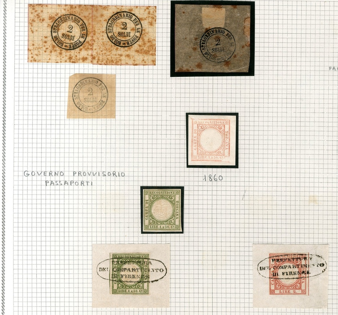 Passport Stamps: Collection (54) on pages including Romagna 1859 1L. and 3L., Sardinia 1858 with proofs, Tuscany 1860 1L. 50 unused and used, 2L. used, etc.; a rare group