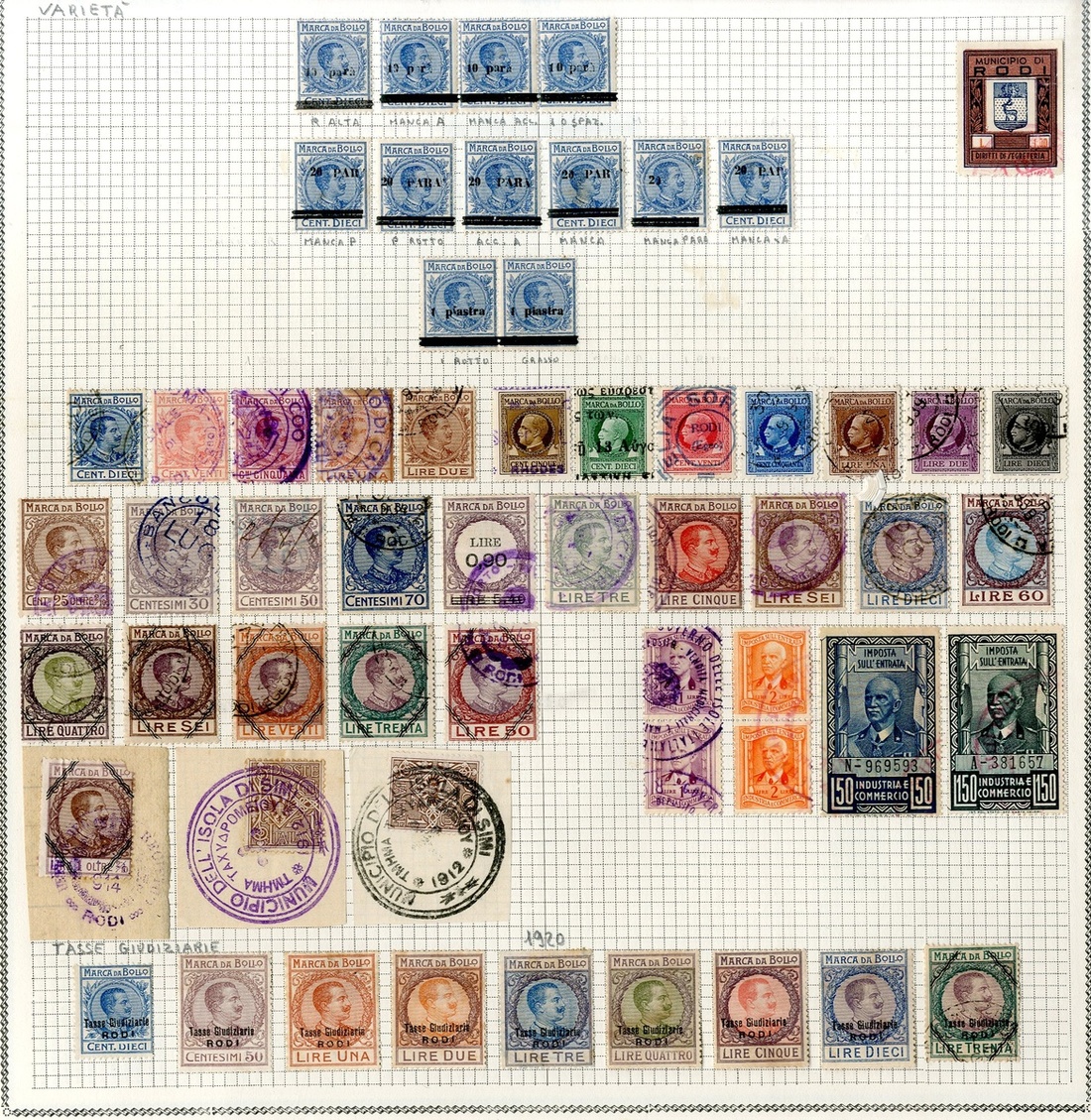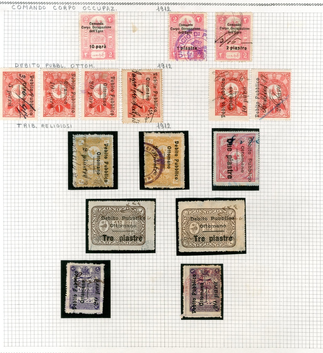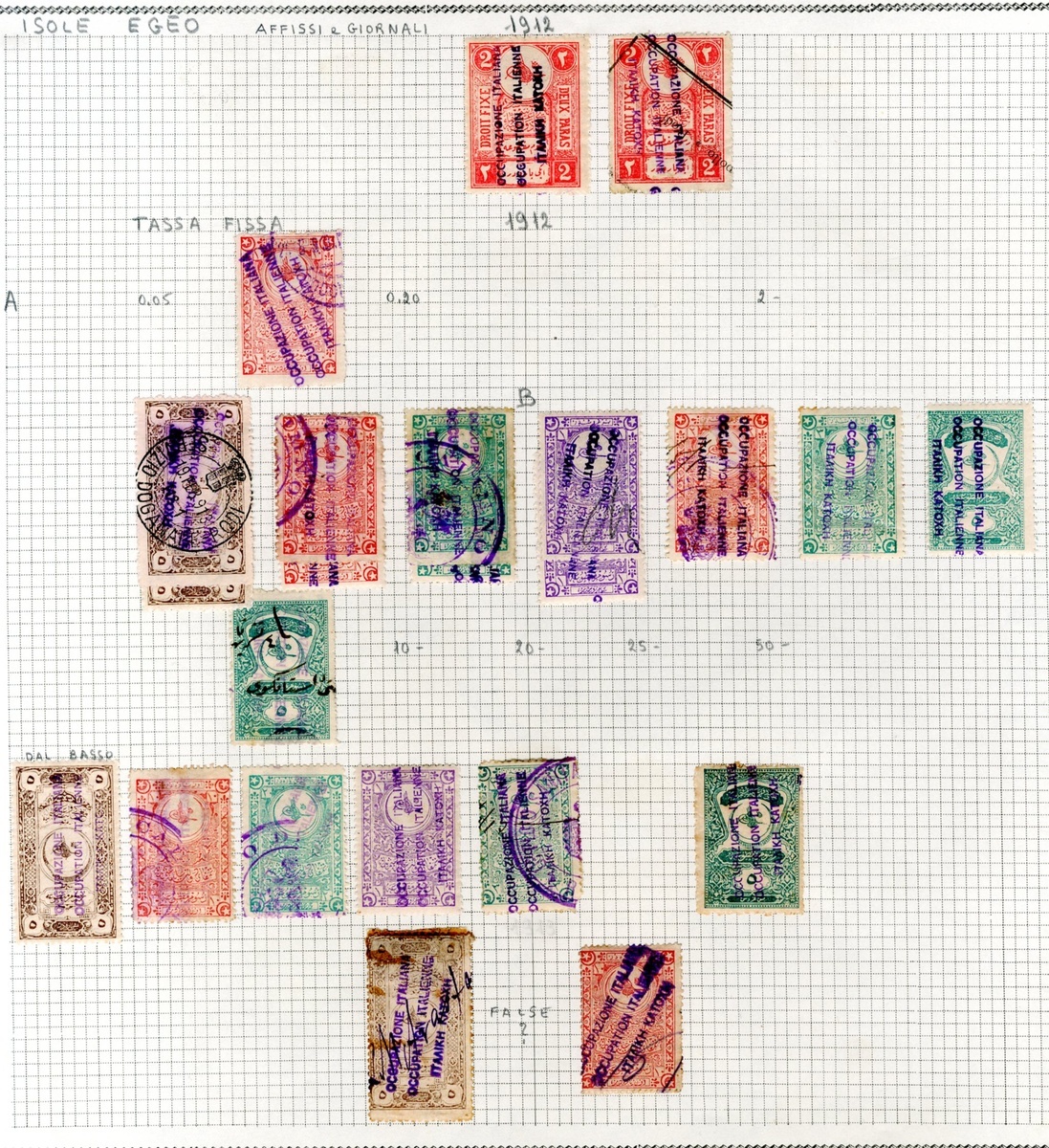 Aegean Islands: Mint and used collection (220+) on leaves including 1912-13 handstamps (80), 1916 Comando Copro 10pa., 1pi., 2pi., 1912 Debito Pubblico overprints (13), 1916 surcharge sets for the various islands, 1916 with values to 15pi., 1921 to 90pi., etc., chiefly fine