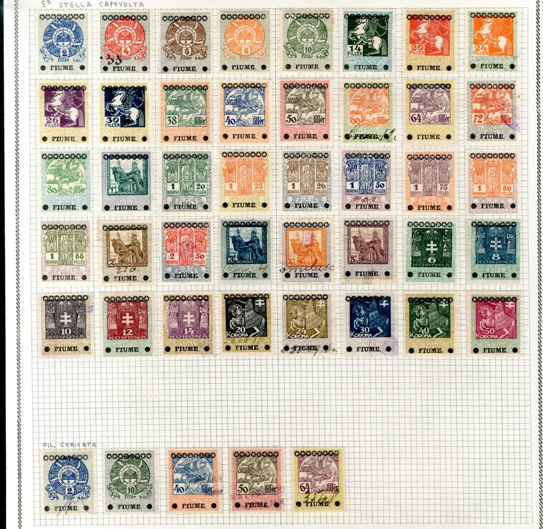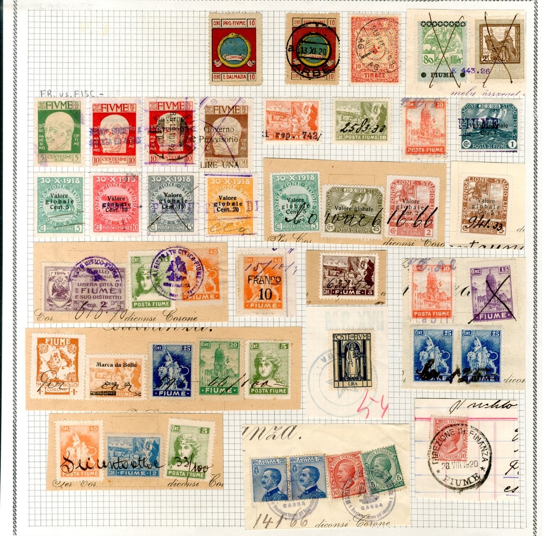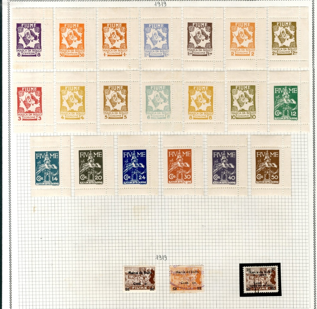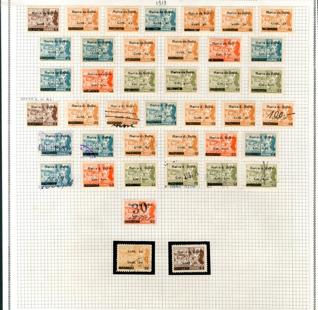 Fiume: Collection on leaves, hundreds including 1919 surcharges on Hungarian fiscals (250+), 1919 8c. to 50c., 1920 to 1922 Bollo surcharges, Contratti di Borsa with many varieties, etc., chiefly fine. An interesting and colourful lot which would be very difficult to duplicate