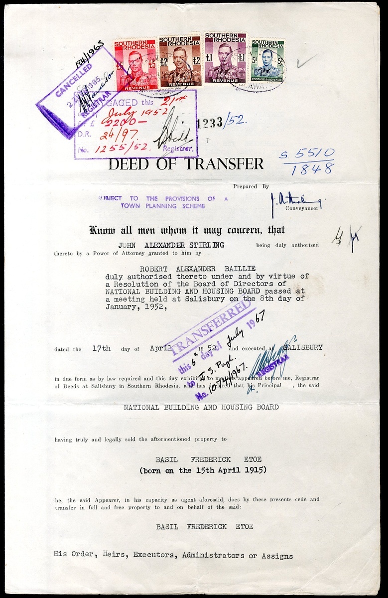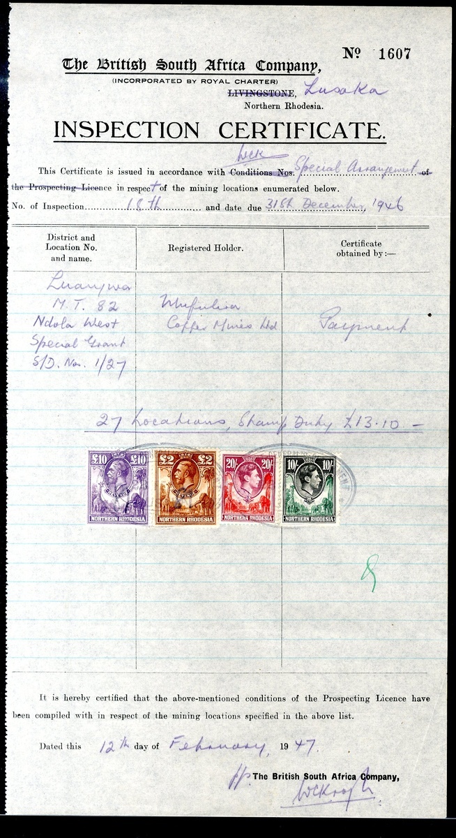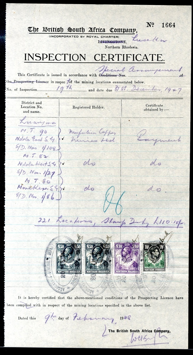 1925 £2 brown, £10 (2) and £50 (2) with K.G.VI 10/- (2) and 20/- on two 1946-47 Inspection Certificates for work on Luanjwa. Also Southern Rhodesia 1952 Deed of Transfer for a property in Bulawayo bearing 1937 £1, £2 and £5 with Postage 5/-. Fine