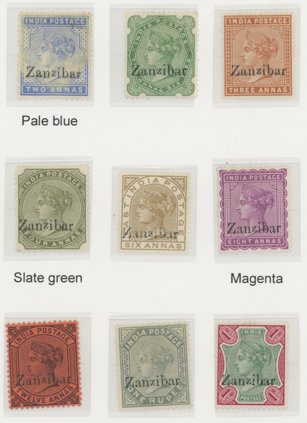 Small second "z" up selection (9) with 2a. pale blue, 2½a., 3a., 4a. slate-green, 6a., 8a. magenta, 12a., 1r. slate and 1r. green and aniline carmine