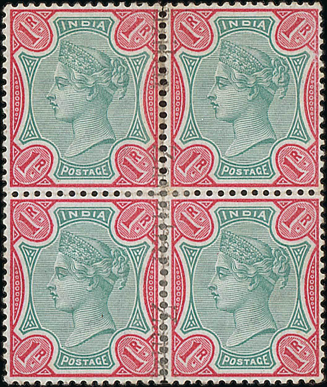 1r. green and aniline carmine block of four with the overprint applied between the stamps and all three impressions of the overprint showing small second "z", large part original gum; split vertically and rejoined, horizontal bend on lower left stamp. The largest multiple of this error recorded. B.P.A. Certificate (2018). S.G. 18j, £1,700+. Photo