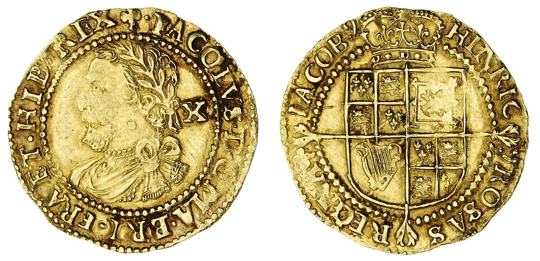 James I (1603-25), Half-Laurel, Third coinage, 4.52g, m.m. trefoil, fourth laureate and cuirassed bust left, value behind, small ties, rev. crowned square-topped shield over cross fourchée (Schneider I, 92; N.2117; S.2641A), near very fine