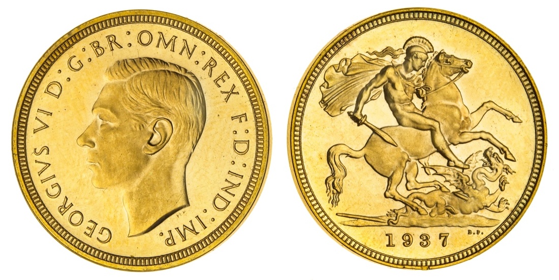 (g) George VI (1937-52), Proof Sovereign, 1937, plain edge (W&R 439; S.4076), an obtrusive clamp mark on reverse edge at 6 o'clock, otherwise light fingermarks over brilliant surfaces, somewhat cameo in appearance, extremely fine or better