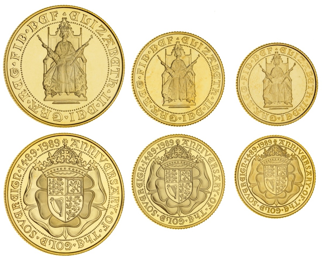 (g) Elizabeth II (1952-), gold Proof Set, 1989 [3], Two Pounds; Sovereign; and Half-Sovereign, "500th Anniversary of the Sovereign" (S.PGS11), brilliant uncirculated, a much sort after year set, in Royal Mint screw capsules of issue [3]