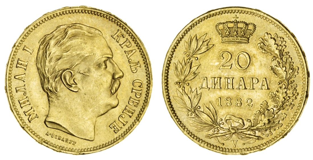 (g) Serbia, Prince Milan I (1868-89), gold 20-Dinara, 1882 (Fb 4; KM 17), choice, practically mint state