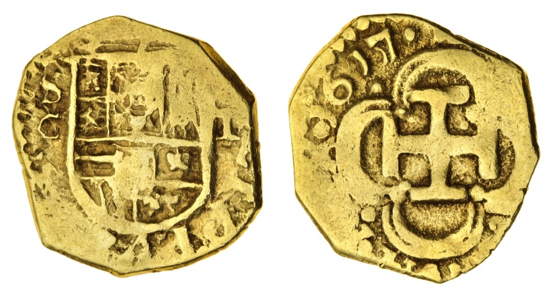 Spain, Philip III (1598-1621), Cob Escudo, 1617 over 6, 3.25g, Seville, assayer G {Gaspar de Talavera} (Áureo & Calicó 311, lot 460, same dies; Calico 66; Tauler 63; Fb. 196; KM 42.2), struck with rusty dies, otherwise good fine and extremely rare, the date known to Calico and Tauler from a sole example, auction records indicate this to be only the third to appear at market
