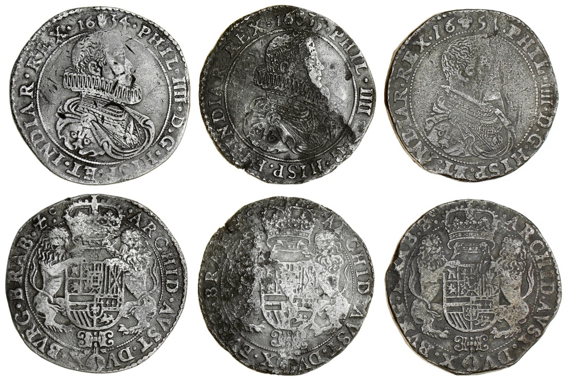 DE LIEFDE: Spanish Netherlands, Brabant, Philip IV (1621-65), Ducatons (3), Antwerp - {Palm of hand} [2], 1634, 31.52g; another, 1635, 30.38g; lastly, Brussels - {Head} 1651, 32.29g (Davenport 4444; 4454), 'sea-salvage' appearance, otherwise generally fine or better (3)